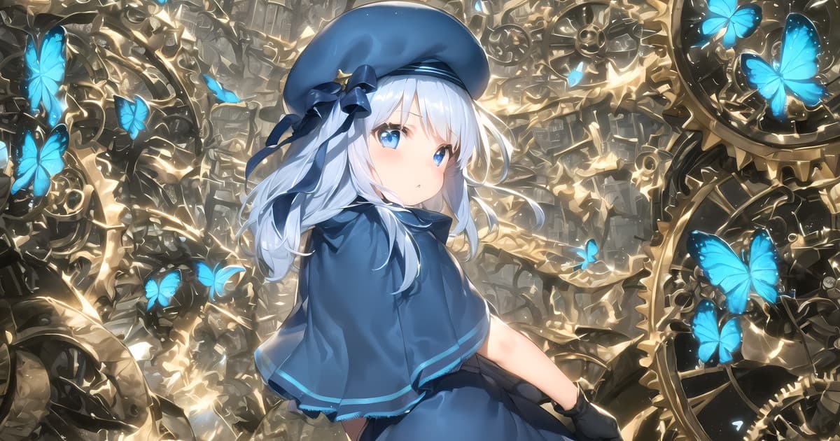 ポジティブ:{{{one little and cute girl at the front}}}, {loli}, {solo}, {masterpiece}, {best quality}, dutch angle, dynamic angle, from front, from angle, from above, from below, [[[[[from side]]]]], [[[[[from back]]]]], dynamic angle, battle form, {{{facing away}}}, the girl has {floating bright light blue hair, long hair}, {detailed and gradient blue eyes}, {blowing wind}, {{{one little and cute girl at the front}}}, {loli}, {solo}, {masterpiece}, {best quality}, the girl wearing {{{{{{short sleeves, simple and short navy blue gloves, angle navy blue beret with long ribbons}}}}}}, {{{laced navy blue coat, laced and short navy blue capelet}}}, {lolita fashion, skirt spreading wide}, {shiny}, {clothes reflecting light}, {sunlight from above}, {{{short sleeves}}}, {{{one little and cute girl at the front}}}, {loli}, {solo}, {masterpiece}, {best quality}, the background is indoors, {clock tower}, remains, dome, {spiral staircase}, antique clocks, pocket watch, {many floating clocks}, {{{many gears}}}, old metal, {{{many translucent butterfly}}}, {{{fantasy}}}, {{{magnificent view}}}, {best quality},