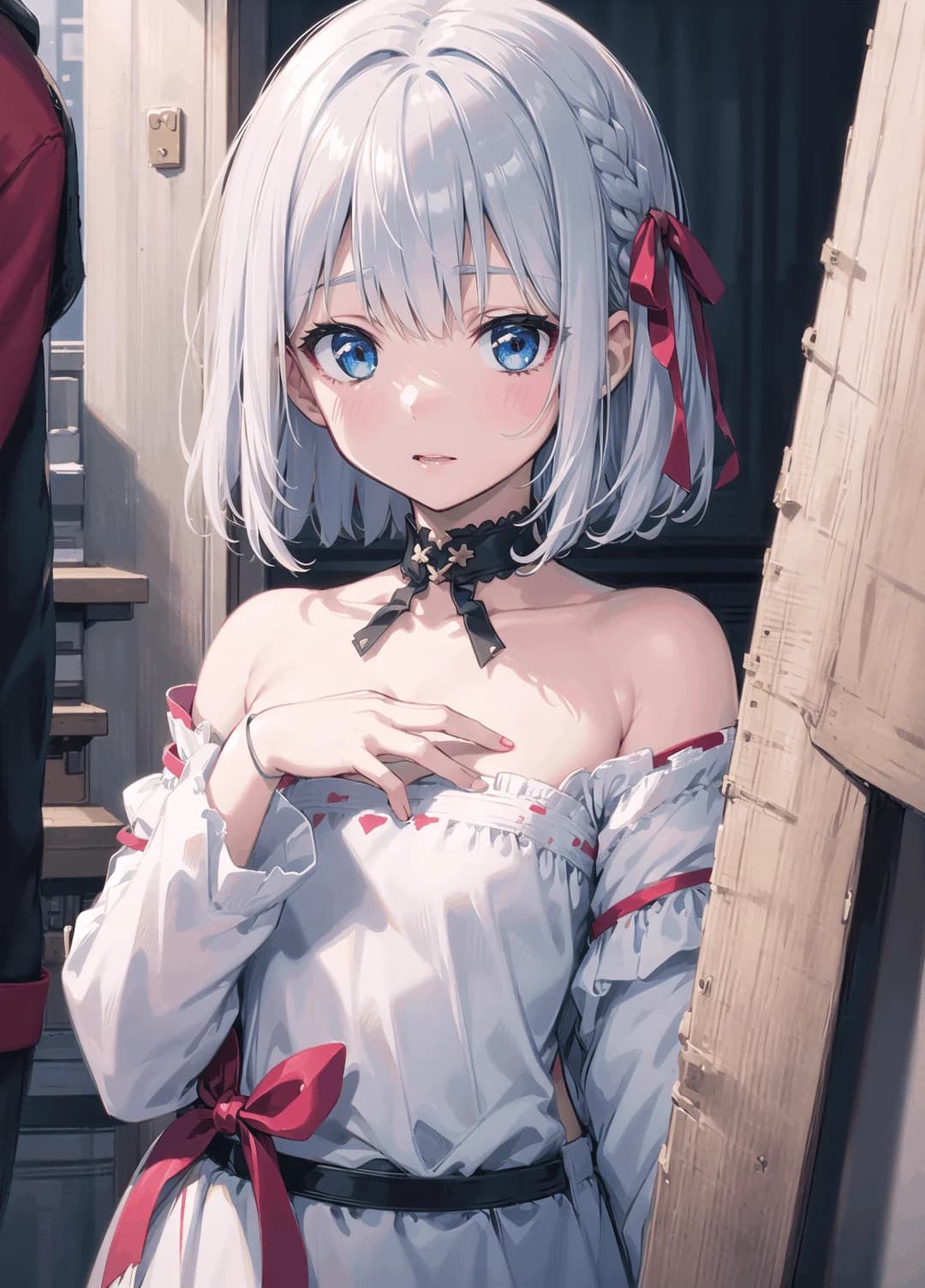 (best quality:1.2),(pastel colore illustration:1.2),(1girl:1.3),upper body,(bob cut:1.2),silver hair,morning,off shoulder dress,hair ribbon red ribbon on side hair, blue eyes,