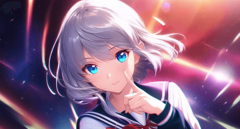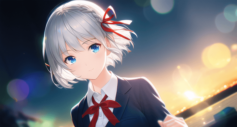 {{masterpiece}}, {{{best quality}}}, {{ultra-detailed}}, {{illustration}}, {{1girl}},solo, school uniform,bob cut,silver hair,eyes blue eyes,hair ribbon red ribbon hair,{{disheveled hair}}, floating, cinematic lighting,{{chromatic aberration}}, {{caustic}}, lens flare,beautiful detailed glow,dynamic angle,depth of field,light_leaks,Amazing,finely detail,extremely detailed CG,Original,star,{{an extremely delicate and beautiful}},glowing,bright,{intricate eye}
