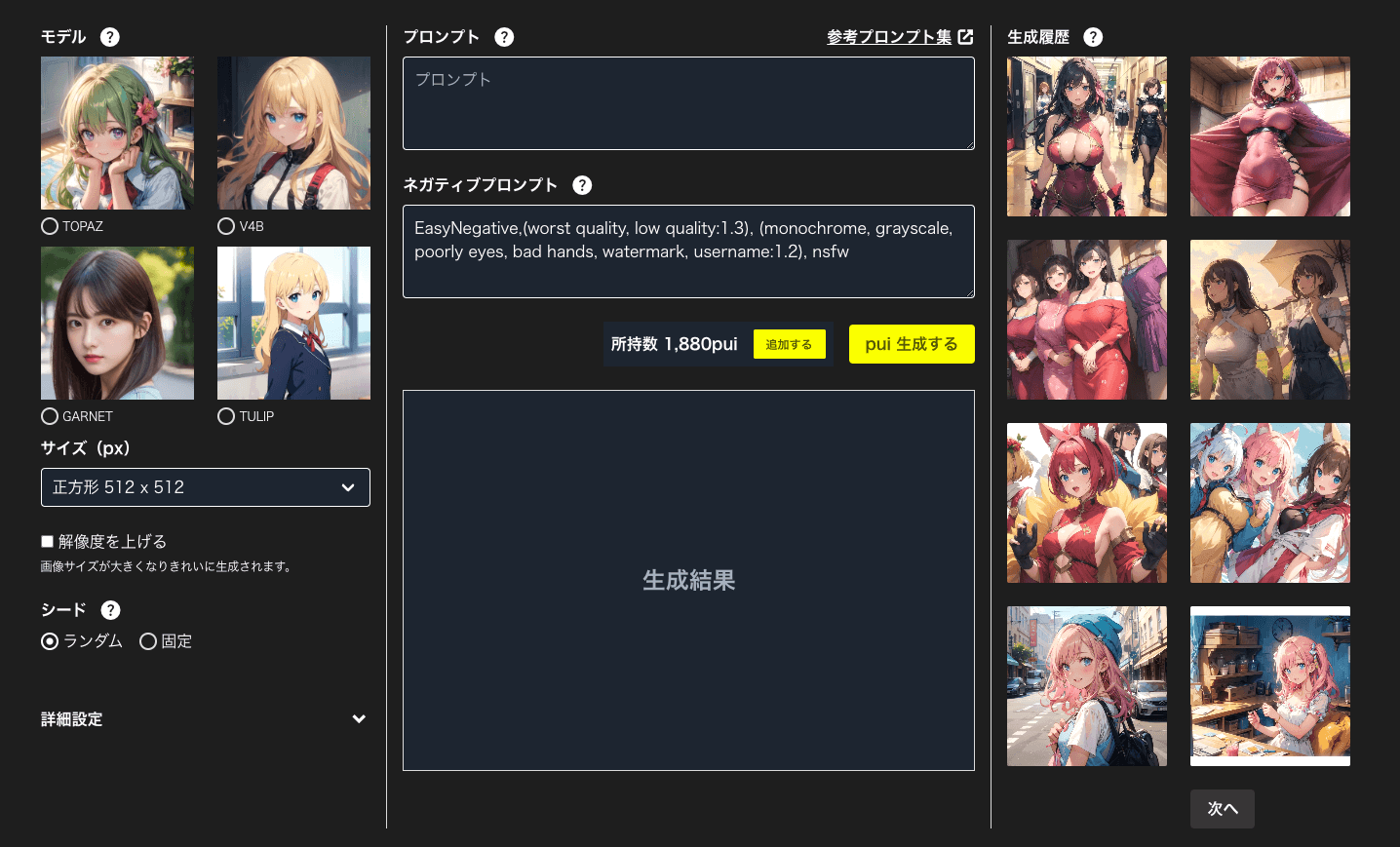AI画像専用の投稿サイト「chichi-pui(ちちぷい)」では無料でAIイラスト・AIグラビア画像を生成する機能を提供しています。