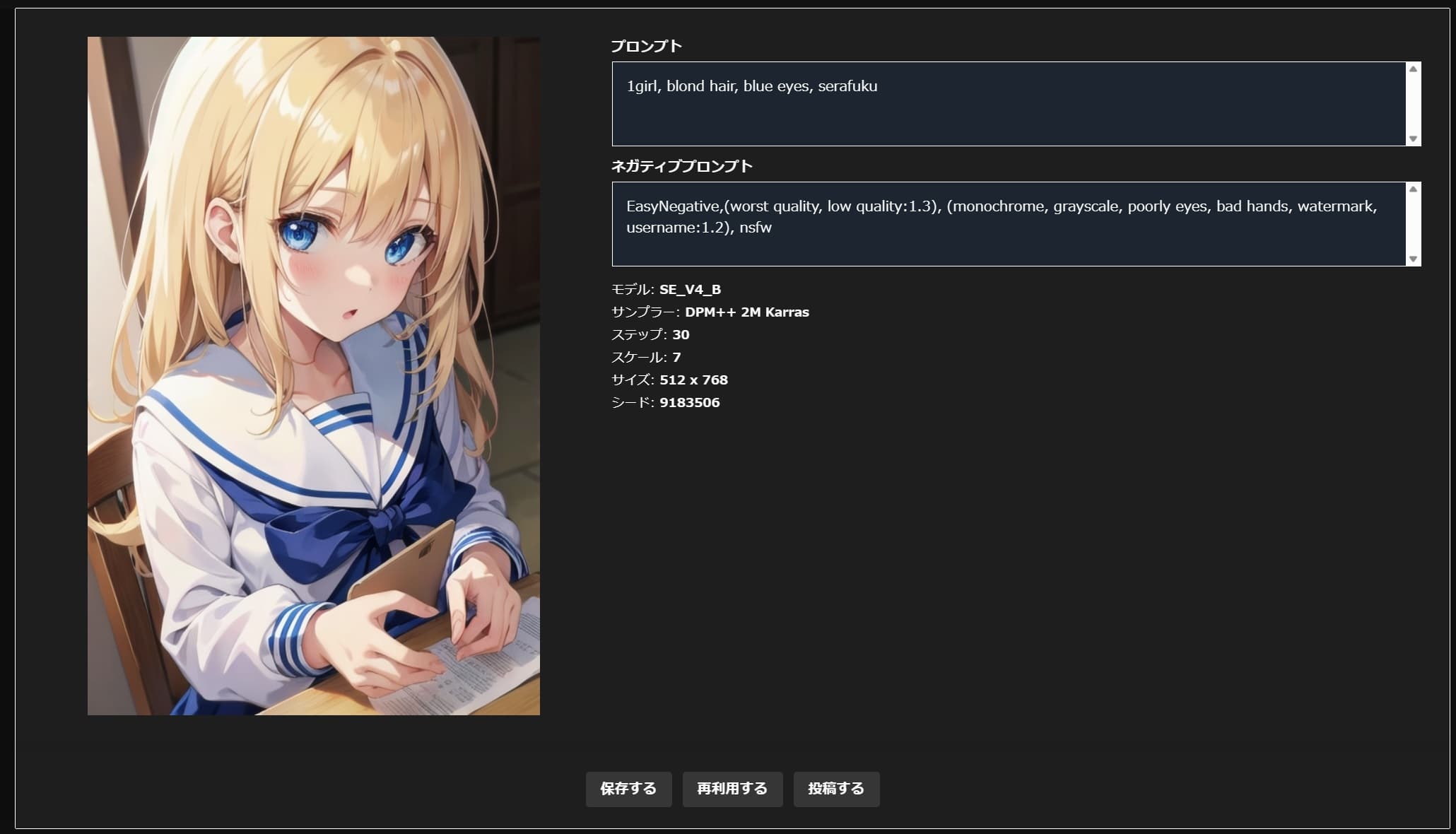 →生成したい内容を英単語で書いてください。例えば「セーラー服を着た青い目の金髪女の子」を出力したい場合は「1girl, blond hair, blue eyes, serafuku」と記入します。