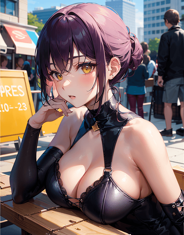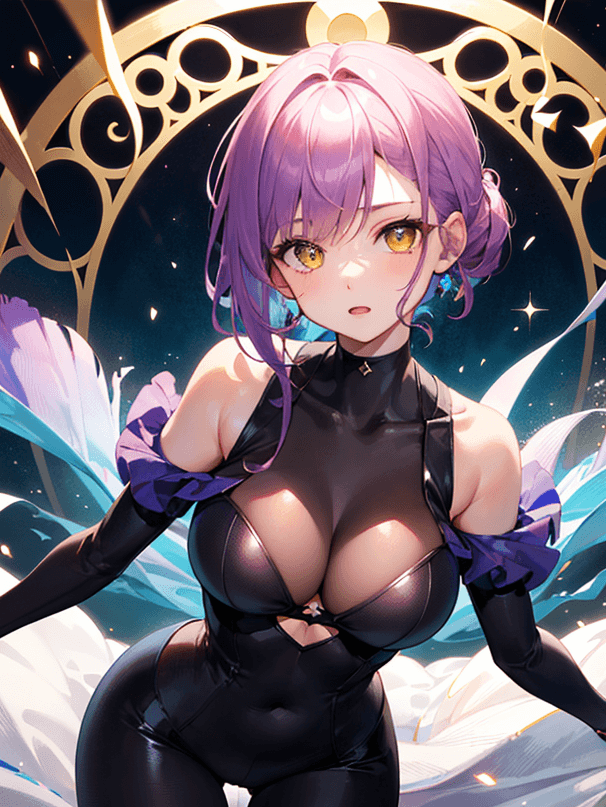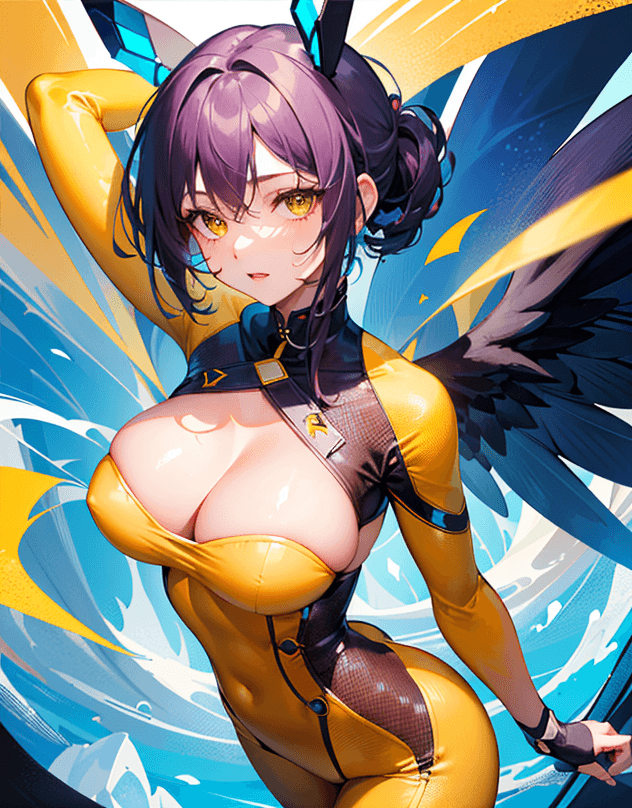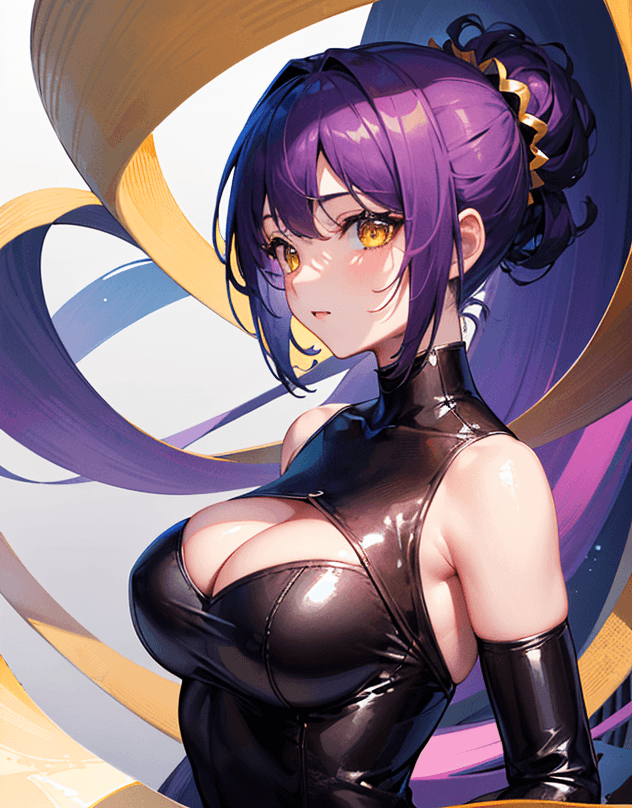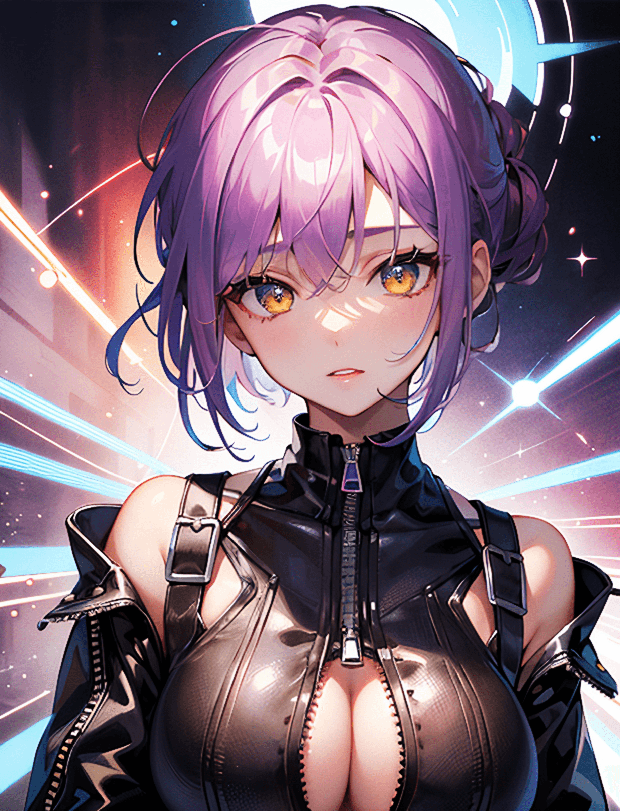 「portrait,(face focus:1.6),(masterpiece,beautiful eyes:1.6),(hyper extreme detailed,high resolution:1.2),1girl,solo,(Violet short hair,Chignon:1.3),yellow eyes,Large breasts, (intricate leather bodysuit:1.3),lace-up,zipper」
