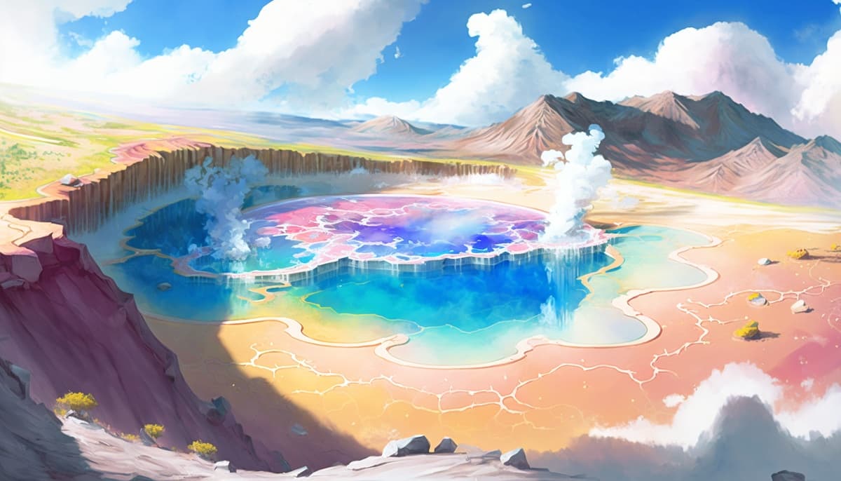 (1)ウェスティリアとの国境付近の丘陵地には、ところどころ熱水泉がある。地中深くから湧き出す水はミネラルが豊富で、生息する微生物により虹色に輝いている。グランゼンの中心部とは違い、この辺りはとても穏やかな気候。