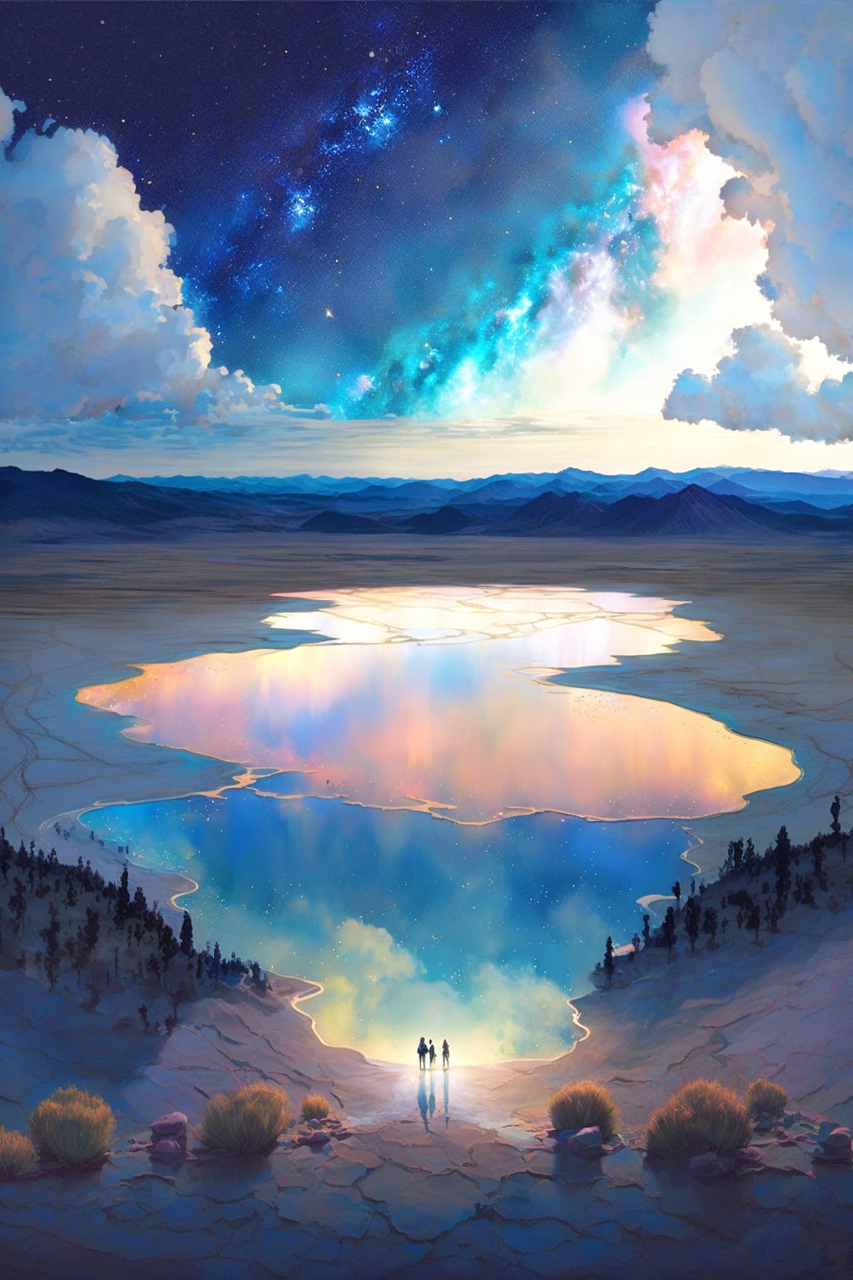 (3)活動を終えた泉は、水鏡が星影を映して静かにきらめく。もう虹色ではなくなったが、空が太陽の光に染まり始めるころ、その輝きを反射してかつての色を取り戻す。この標高に住むものたちだけが見ることが出来る景色。