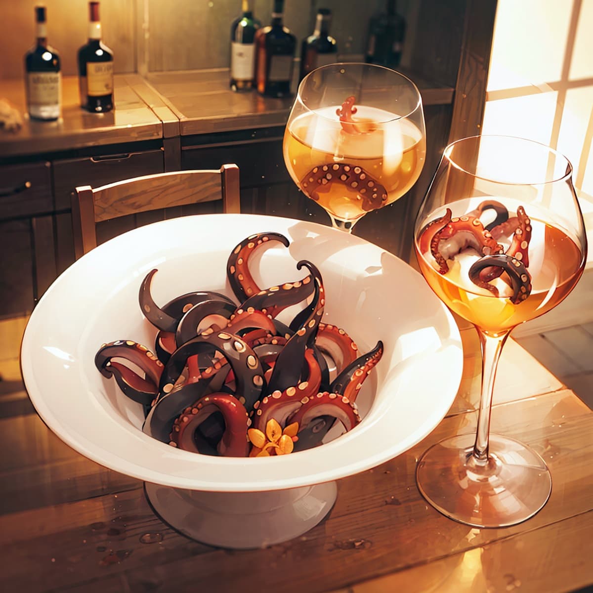 ウェスティリア国内の酒場で広く親しまれているカクテルワイン。見ての通りぶつ切りにされたタコの足が漬け込まれており、強い塩味と独特の触感をワインと共に楽しむ。別皿に盛られたタコ足はそのままつまみとしても食べられる。国内では人気が高いが、国外からの旅行者には大抵不評。ウェスティリア国人を装う外国人(大抵エルフェアル人とされる)に対し、蛸足ワインを勧めてその反応からウェスティリア国人ではないと看破する定番のジョークがある。