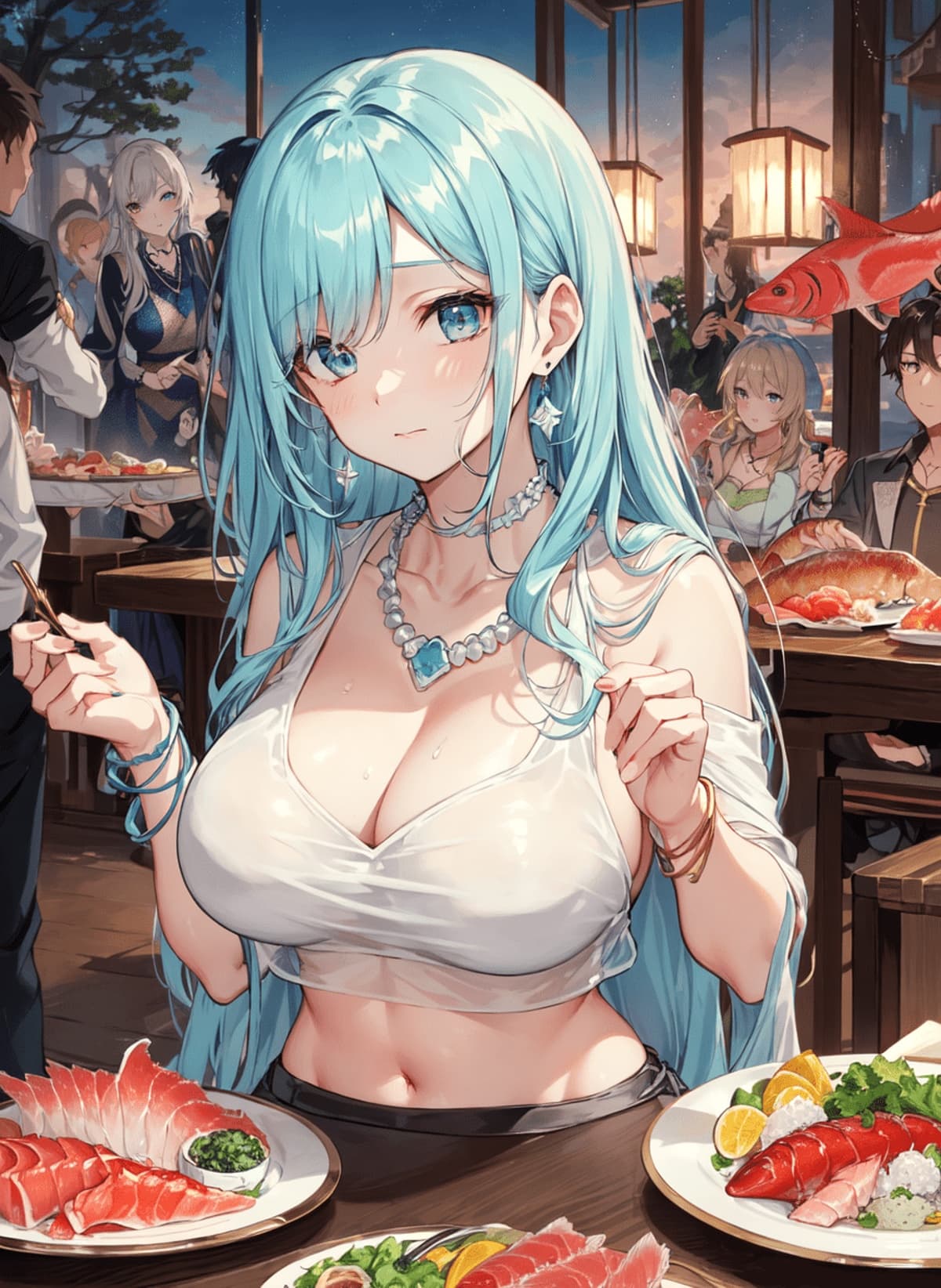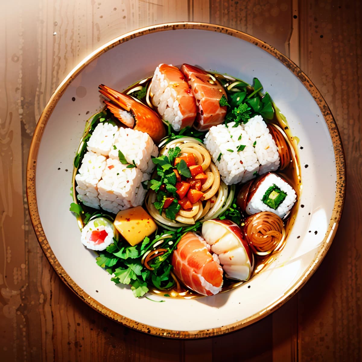 これはスシヌードル。ウェスティリア名産の新鮮な海産物を使ったスシ、という料理に伝統的な汁麵を組み合わせた全く新しい料理だよ!え?スシのライスは穀物、麺の素材も穀物でバランスが悪いんじゃないかって?HAHAHA、魚がいっぱい入っているんだからヘルシーに決まってるじゃないか!