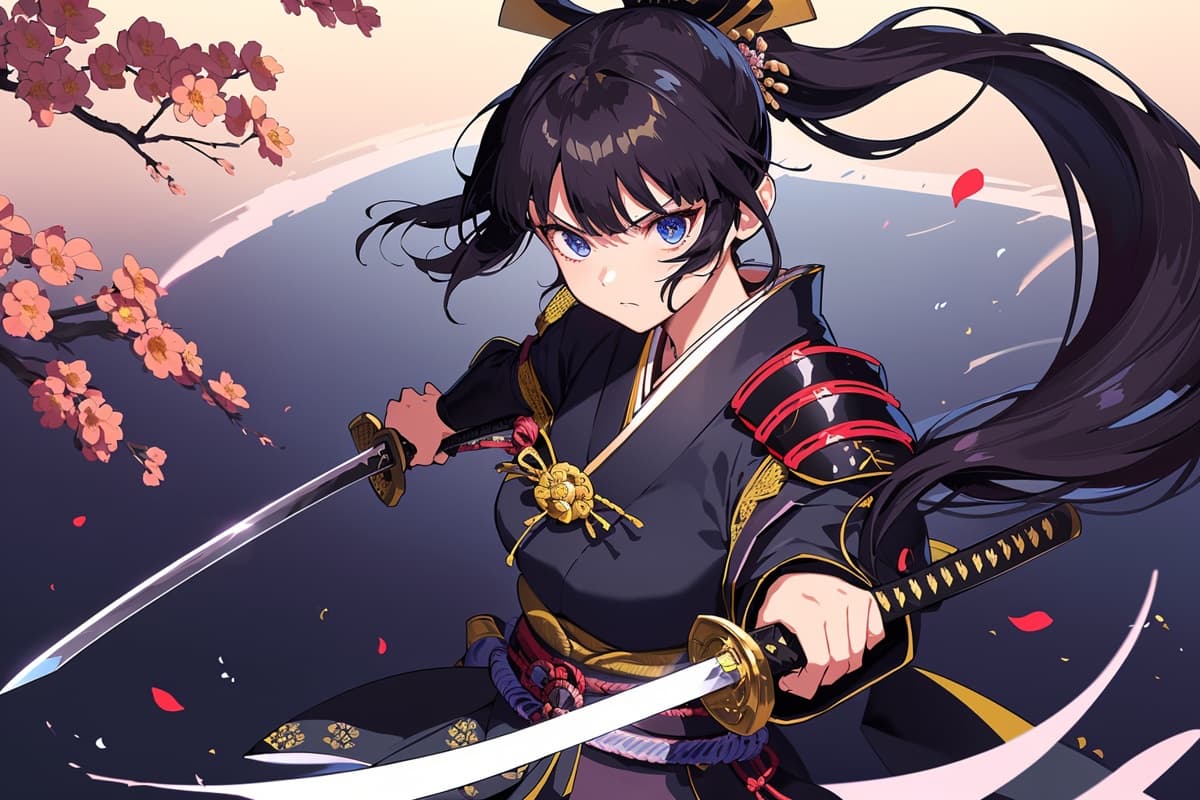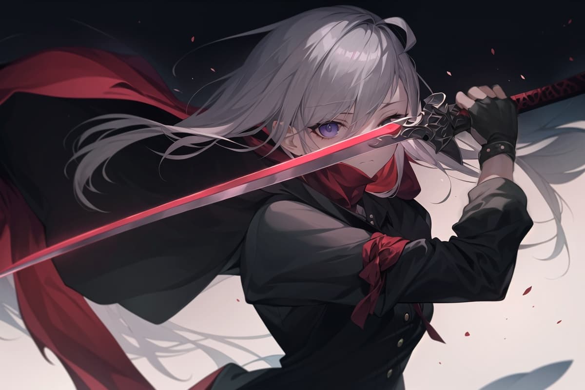 「covered one eye」と「holding a red sword to the side」で刀を持ちながら片目を隠す描写を表現している部分に痺れました!加筆やinpaintの使い方も上手に使いこなしていて、全体的な完成度も高く素晴らしい作品です。