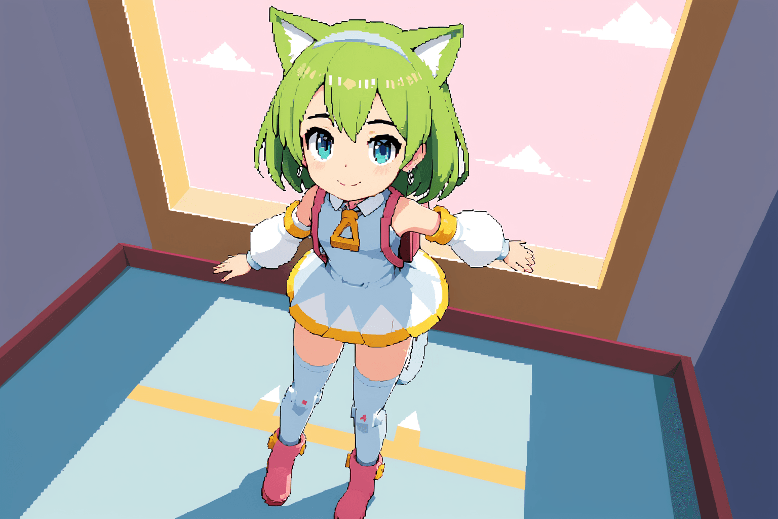 <lora:deltamon_SDXL:0.7>deltamon, 1girl, solo, pov, green hair, blue eyes, short hair, smile, cat ear, detached sleeves, blue dress, earrings, randoseru, tail, white thighhighs, pink boots,full body, dyanmic angle, BREAK (Pixel art:1.5),