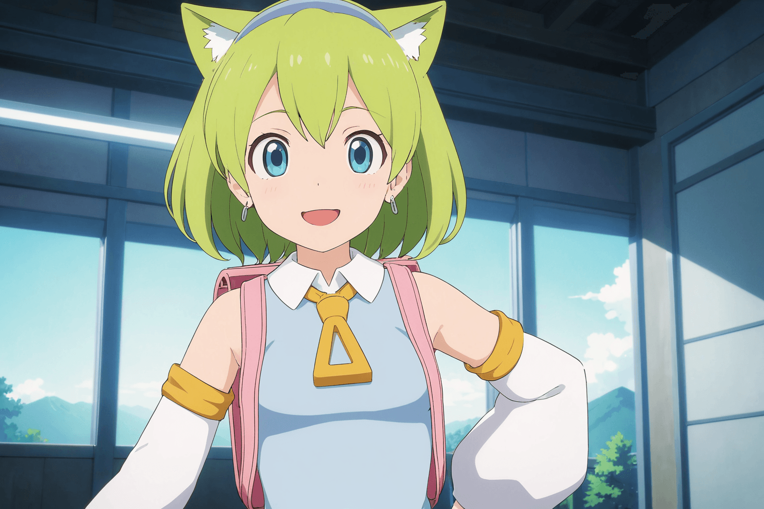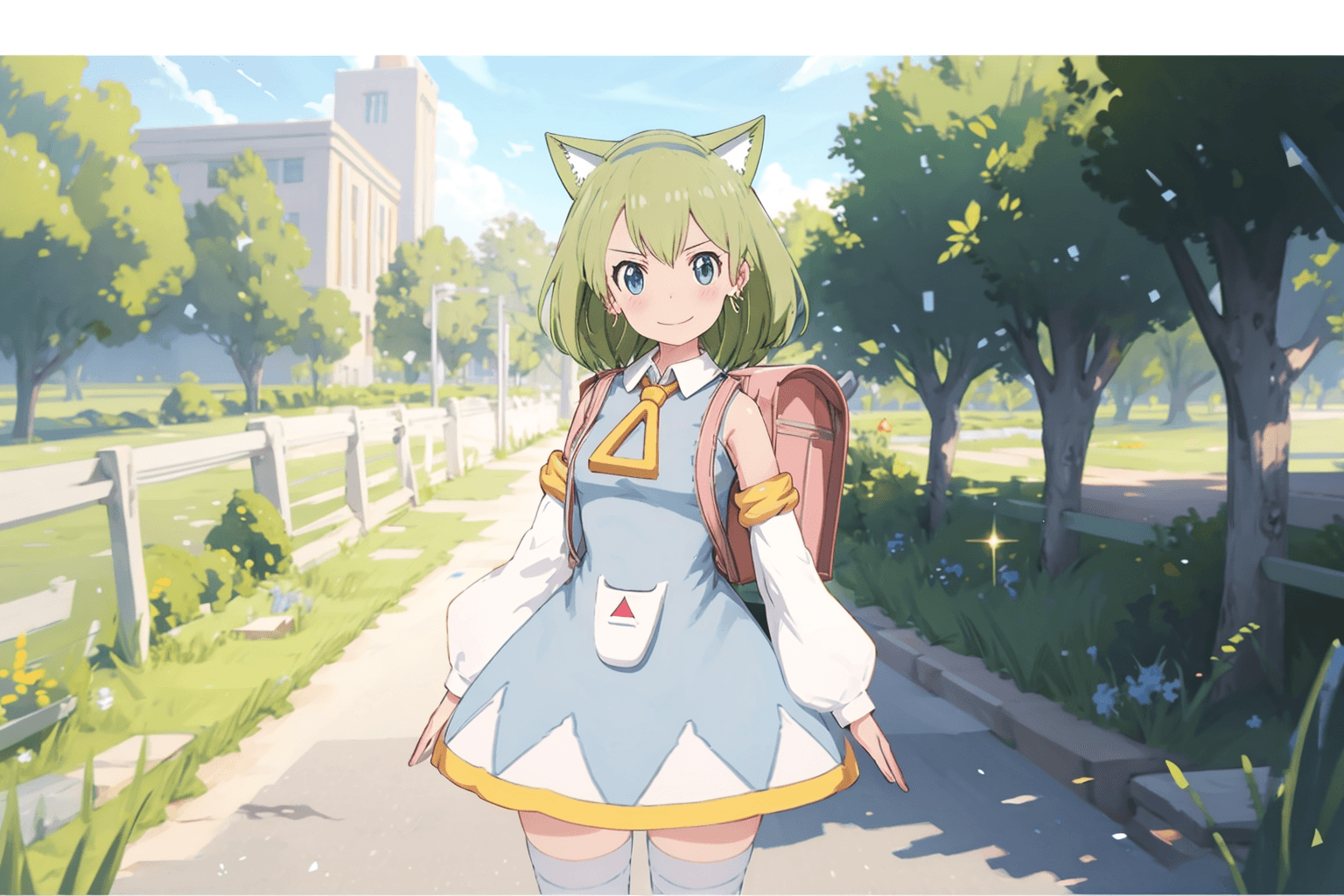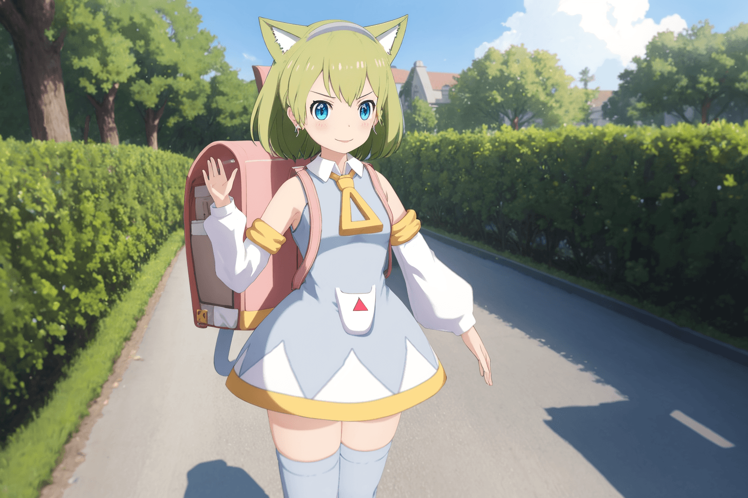 <lora:deltamon_SDXL:0.73>deltamon, 1girl, solo, green hair, blue eyes, short hair, (smile:1.4), open mouth, cat ear, detached sleeves, blue dress, earrings, hairband, detached sleeves, randoseru, blue tail, randoseru, pink backpack, Yellow triangle shaped tie, (white thighhighs:1.3), BREAK, (anime screencap, flat color:1.4),