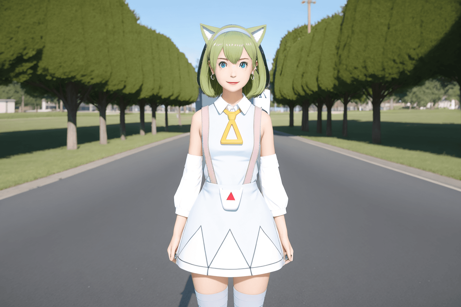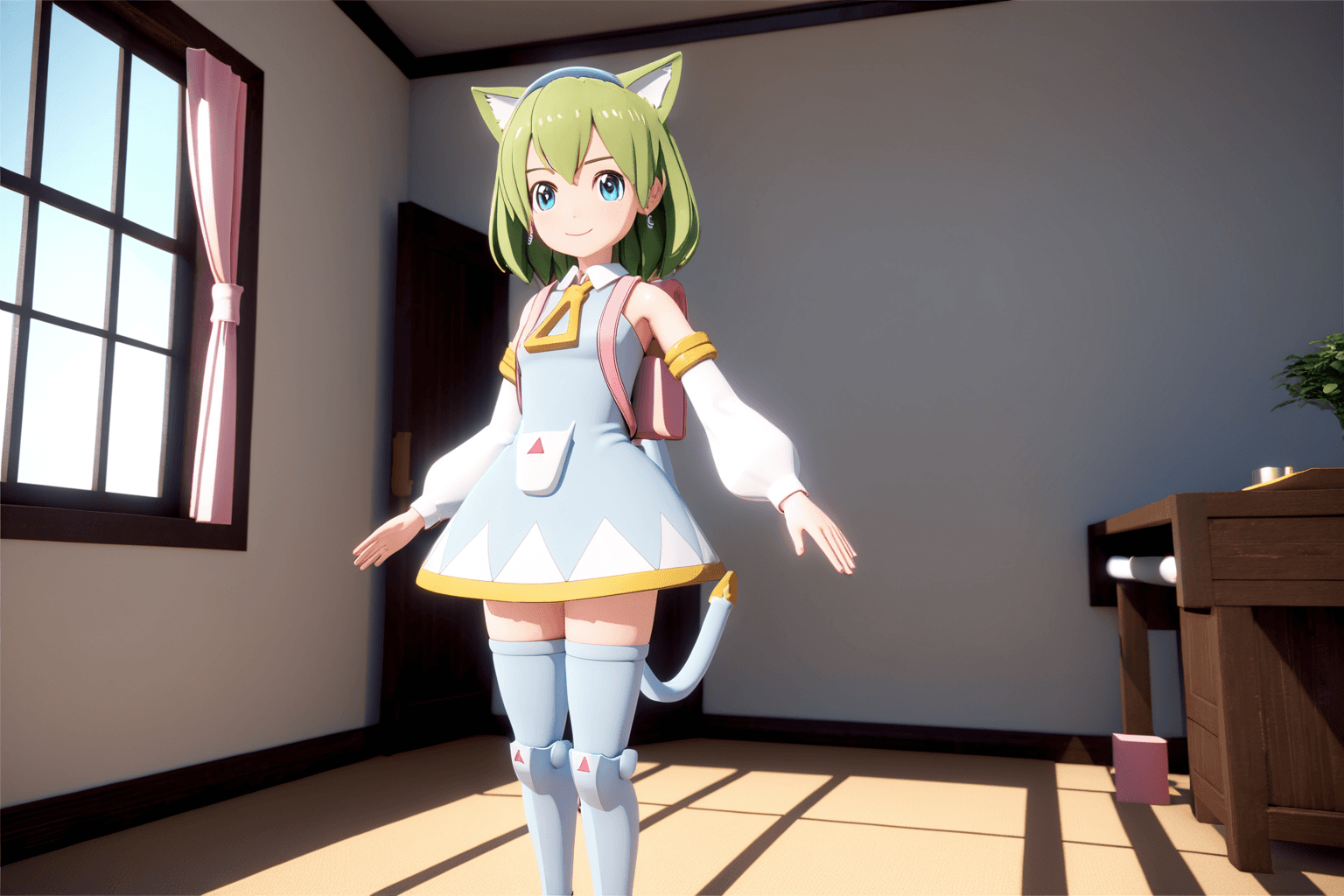 <lora:deltamon_SDXL:0.73>deltamon, 1girl, solo, pov, green hair, blue eyes, short hair, smile, cat ear, detached sleeves, blue dress, earrings, pink randoseru, tail, white thighhighs, full body, dyanmic angle, BREAK, (3D, realistic:1.4),