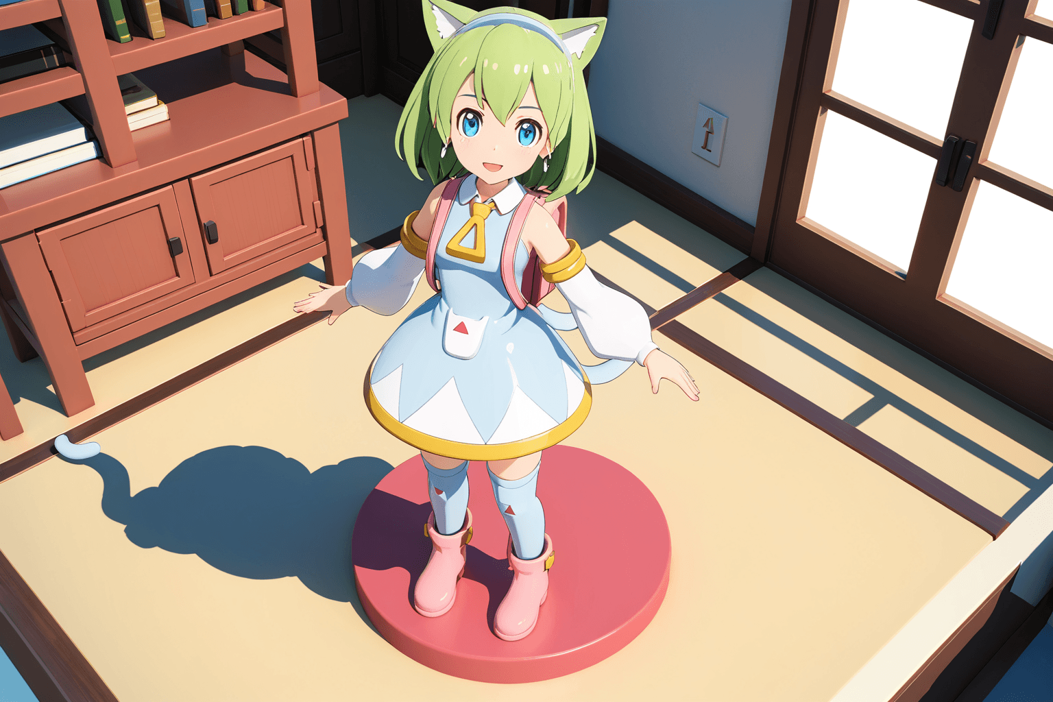 <lora:deltamon_SDXL:0.7>deltamon, 1girl, solo, pov, green hair, blue eyes, short hair, smile, open mouth, cat ear, detached sleeves, blue dress, earrings, detached sleeves, randoseru, blue tail, randoseru, pink backpack, triangle shaped tie, white thighhighs, pink boots, full body, dyanmic angle, table, indoor, clear case, BREAK, (faux figurine, 3D:1.5),