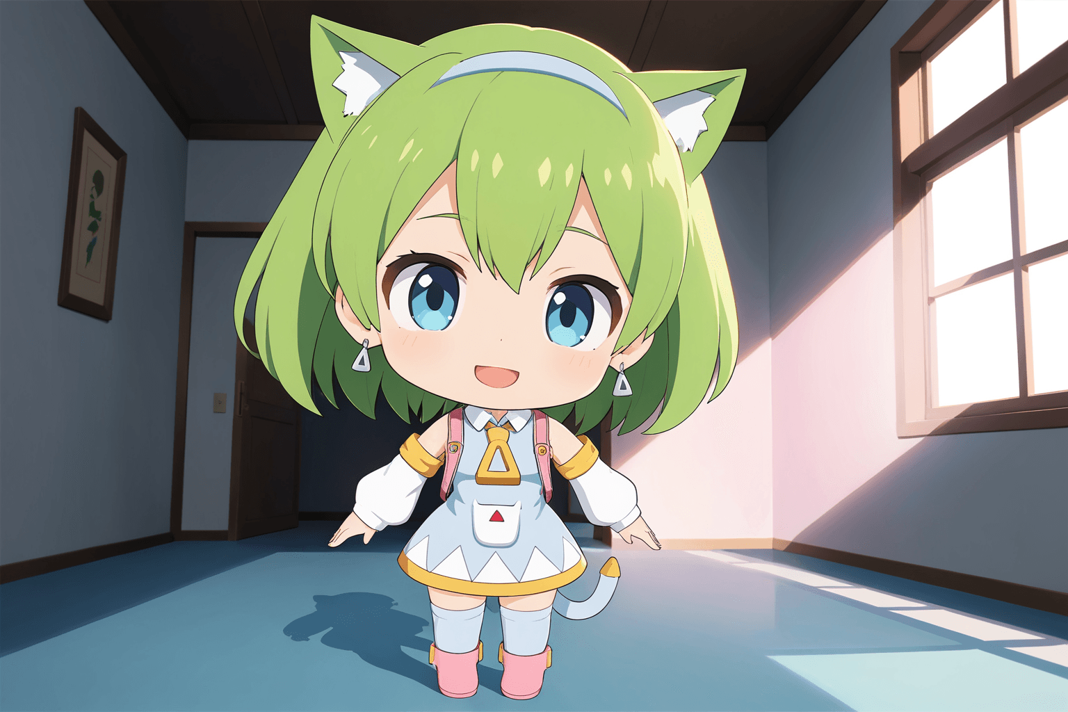 <lora:deltamon_SDXL:0.7>deltamon, 1girl, solo, pov, green hair, blue eyes, short hair, smile, open mouth, cat ear, detached sleeves, blue dress, earrings, detached sleeves, randoseru, blue tail, randoseru, pink backpack, triangle shaped tie, white thighhighs, pink boots, full body, dyanmic angle, table, indoor, BREAK, (eyes highlight, chibi, flat, full body:1.5),