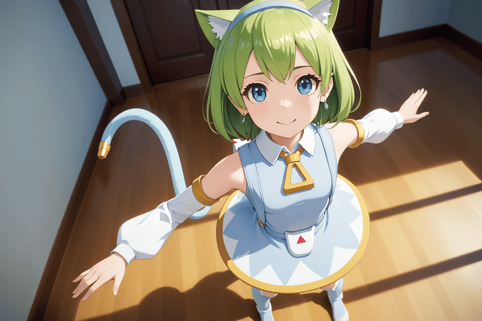 <lora:deltamon_SDXL:0.7>deltamon, 1girl, solo, pov, green hair, blue eyes, short hair, smile, cat ear, detached sleeves, blue dress, earrings, randoseru, tail, white thighhighs, full body, dyanmic angle, BREAK, (realistic:1.4),