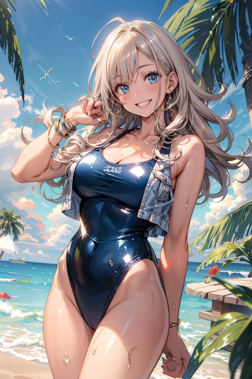 photo realistic, photo of beautiful jpn-gyaru, wearing navy school one-piece swimsuit, , U-neck, wet, Dutch angle, beautiful sensuous blue eyes, shiny black fluttering hair, (big smile:1.5), forward light, in the beach, turquoise blue, sunshine, blue sky, island,