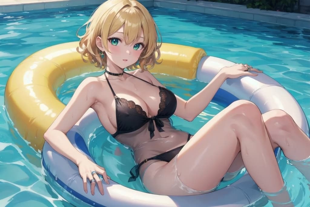 pool, ((floral float ring)), float ring is floating in the pool, sitting on float ring,