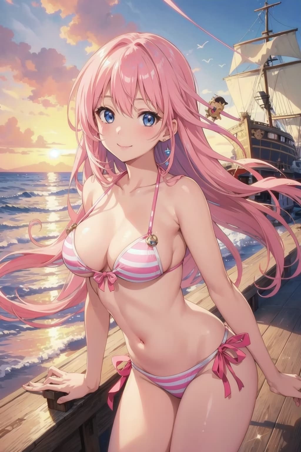 ((masterpiece)),(best quality), photo realistic, photo of beautiful jpn-gyaru, small breast, wearing glitter shining pink string bikini, big anime blue eyes with reflection, shiny floating pink hair, just smile, sunset beach, port side, pier, pirate ship, Seagull,