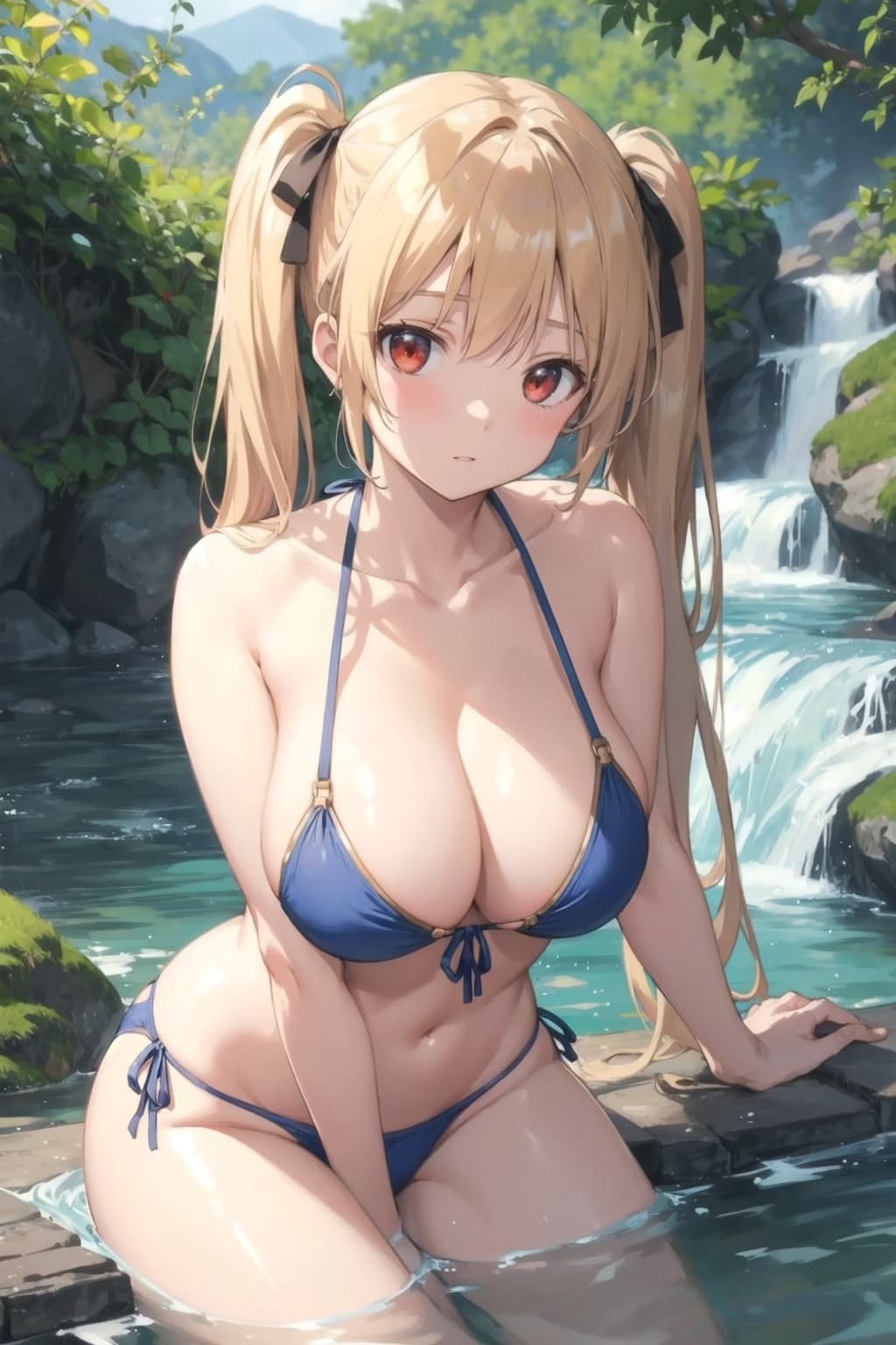 masterpiece, high-res, detailed,1girl, hanging big breasts, cleavage, strap bikini, soft lighting, beautiful detailed skin, glareming oiled skin, sitting and resting at the edge of a beautiful stream, twintails,