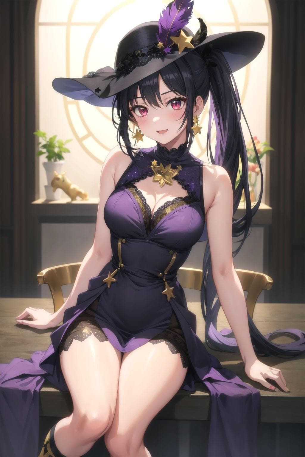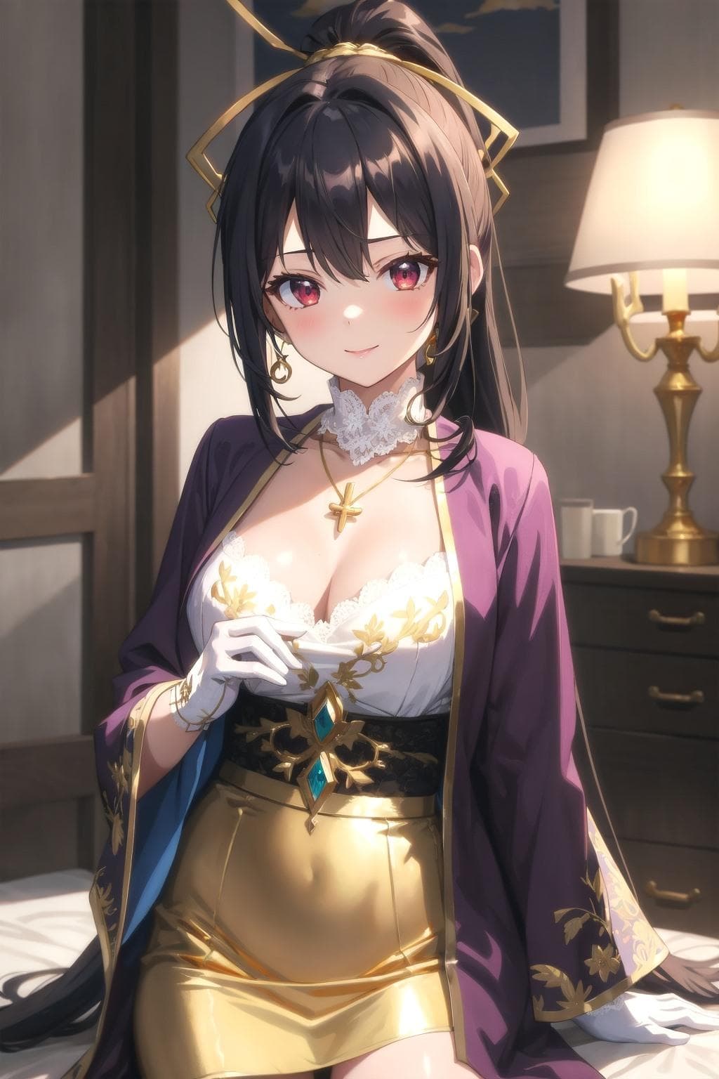 (deep purple gold white color palette:1.3),(deep purple velvet robe with gold embroidery:1.4),(white lace blouse:1.4),(golden skirt:1.3),(white lace gloves:1.2),(gold pendant necklace:1.1),(purple headband:1.1)
