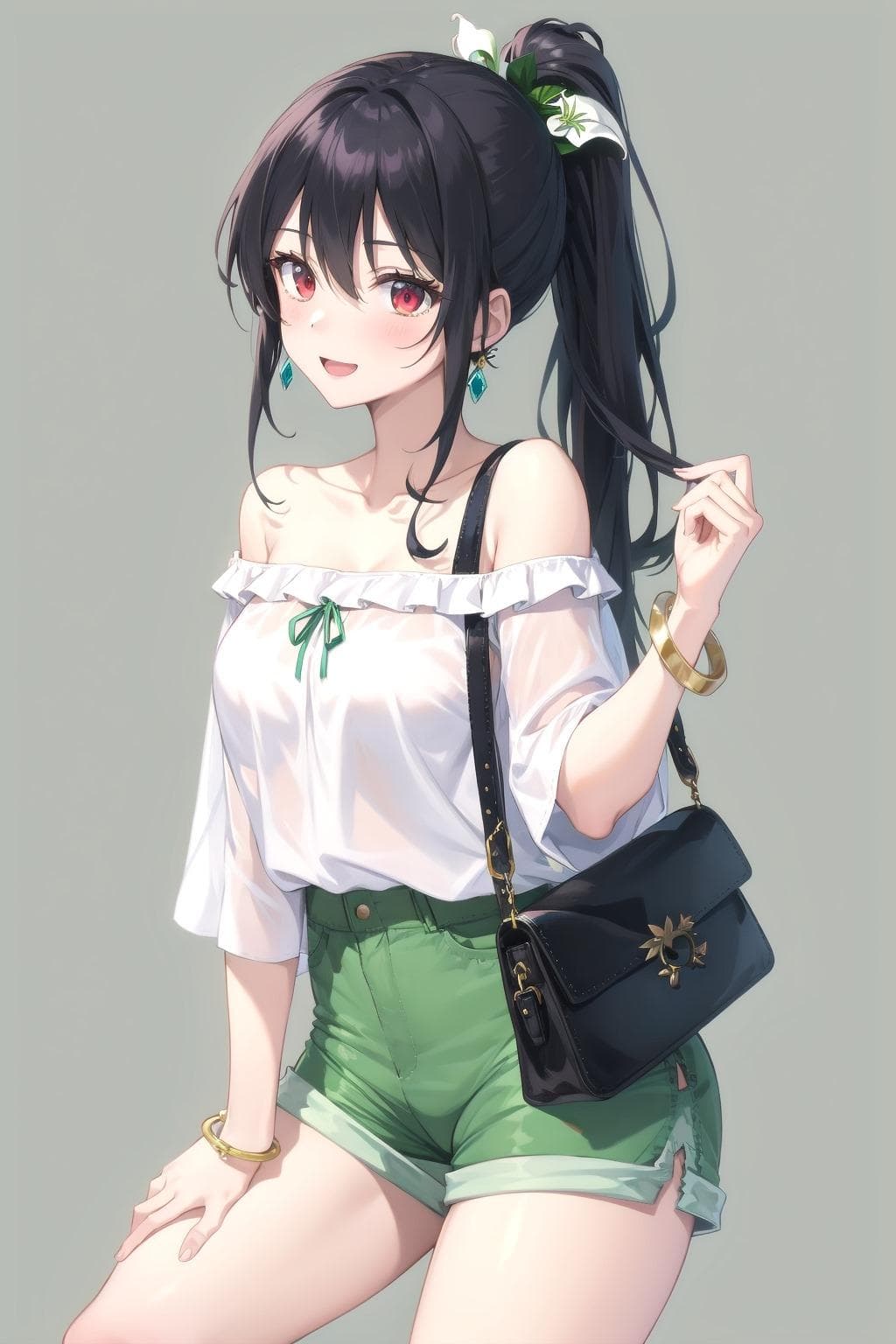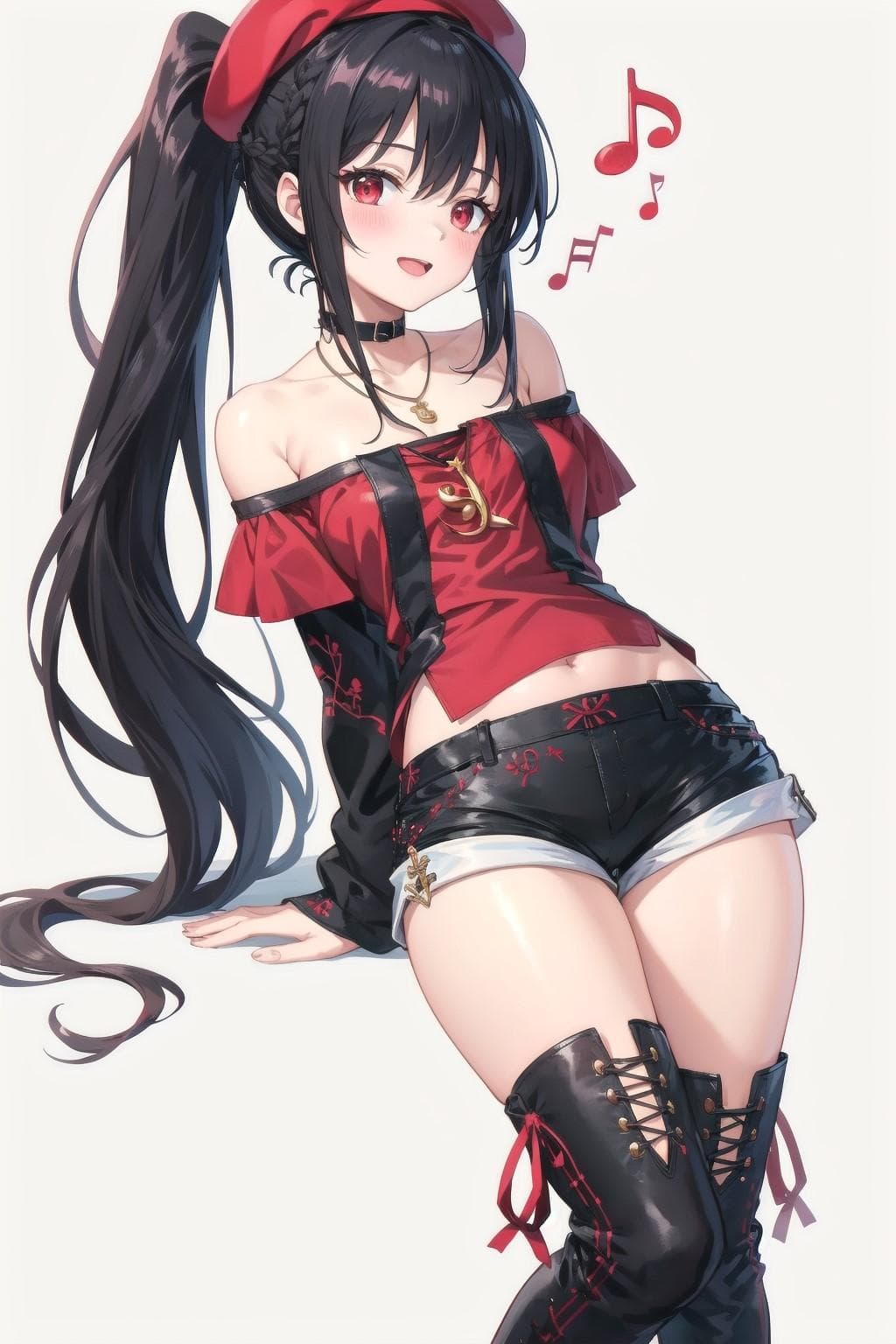 (black red white color palette:1.3),(red off-shoulder top with white treble clef embroidery:1.4),(tailored shorts:1.2),(lace-up boots:1.2),(black beret with red accents:1.1),(musical note necklace:1.1)