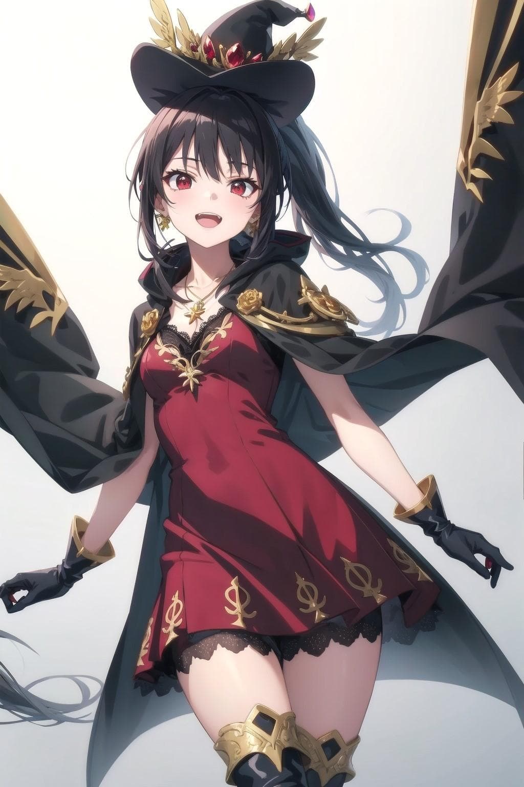 (ruby red black gold color palette:1.3),(ruby red dress with black lace and gold accents:1.4),(black satin gloves:1.2),(gold embroidered black cloak:1.2),(brown short boots:1.1),(ruby pendant necklace:1.1),(black feathered hat with gold details:1.1)