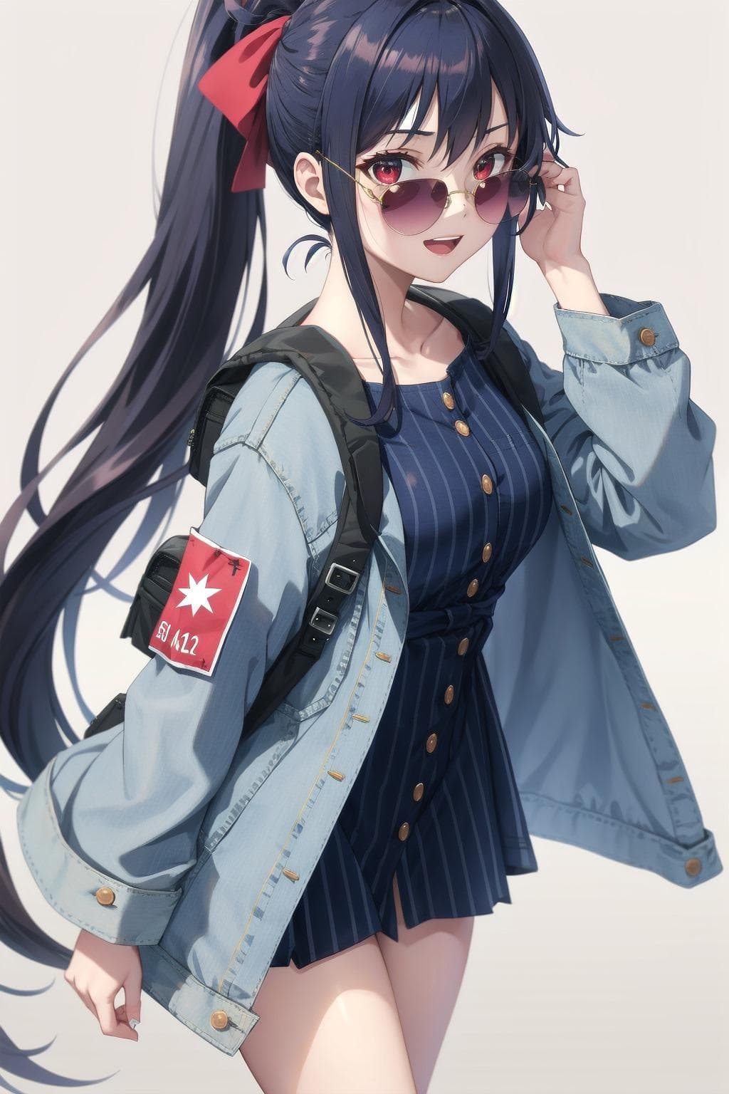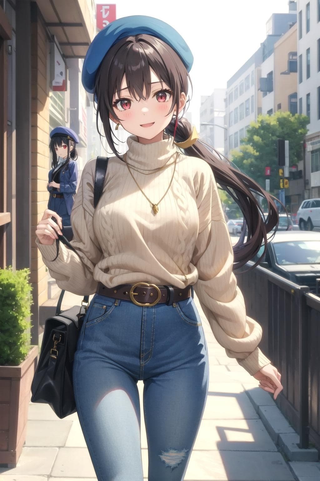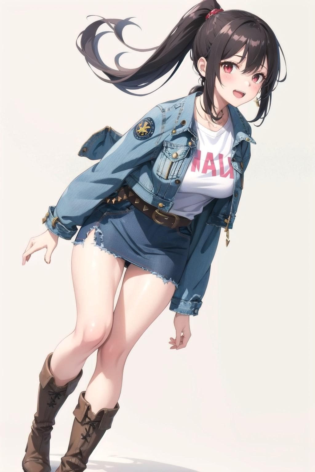 (blue, white, brown color palette:1.3),BREAK,(blue denim jacket:1.4),(white graphic tee:1.2),denim skirt,(brown boots:1.2),(studded belt:1.2)