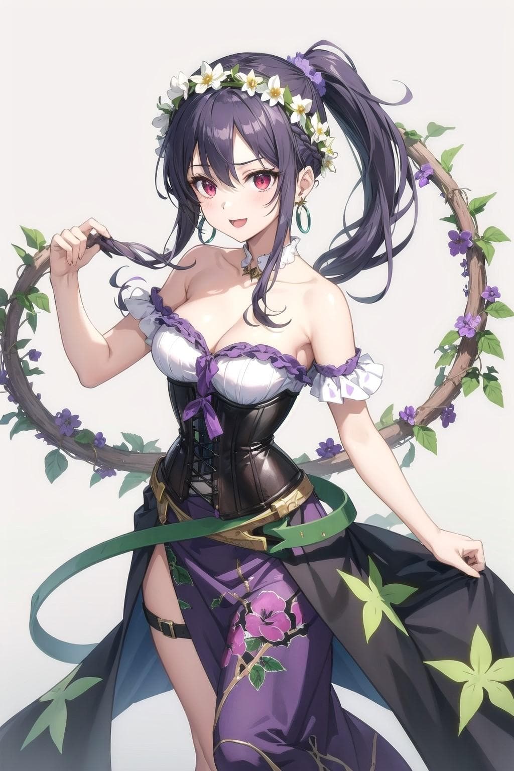 (purple, green, silver color palette:1.3),BREAK,(purple corset top with vine print:1.4),(green maxi skirt:1.2),silver gladiator sandals,(purple earrings:1.1),(vine wreath headband:1.2)