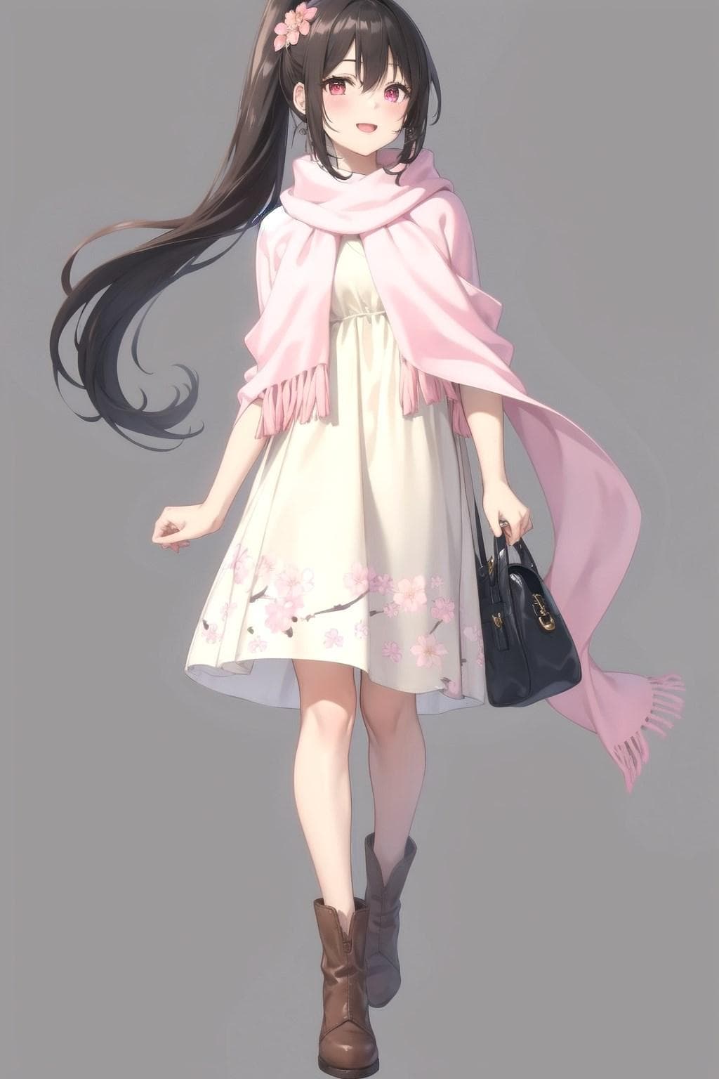 (Pink, cream, brown color palette:1.3),(Simple cream dress:1.4),(Pink Cherry Blossom Print Shawl:1.2),Brown Ankle Boots,(Pink handbag:1.2)