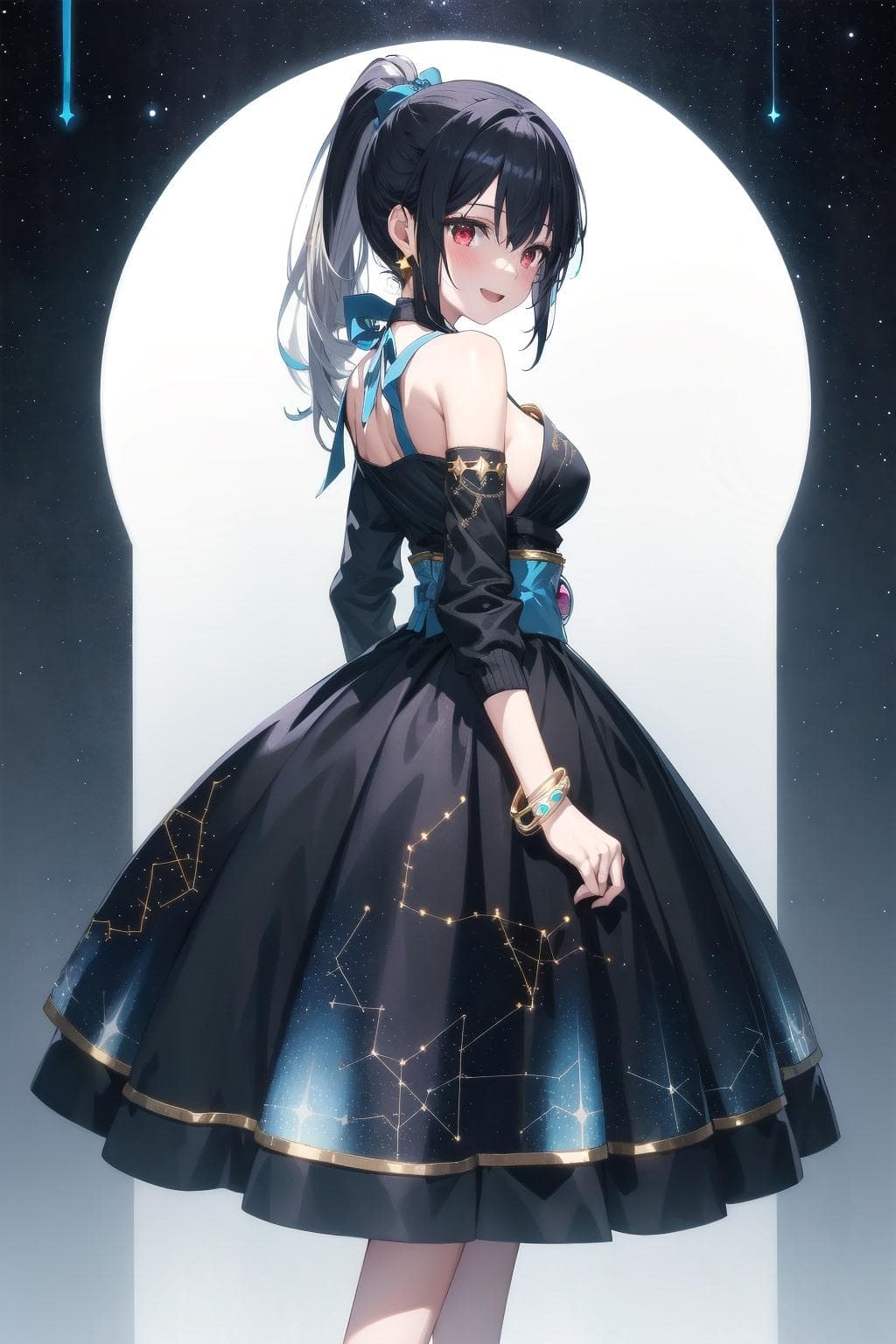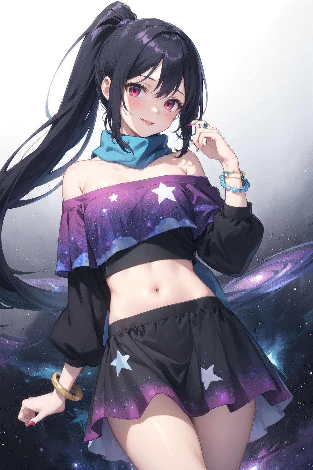 (black blue purple color palette:1.3),(black off-shoulder top with blue and purple galaxy print:1.3),(blue tulle skirt:1.2),(silver star bracelet:1.1),(blue and purple ombre scarf:1.1)
