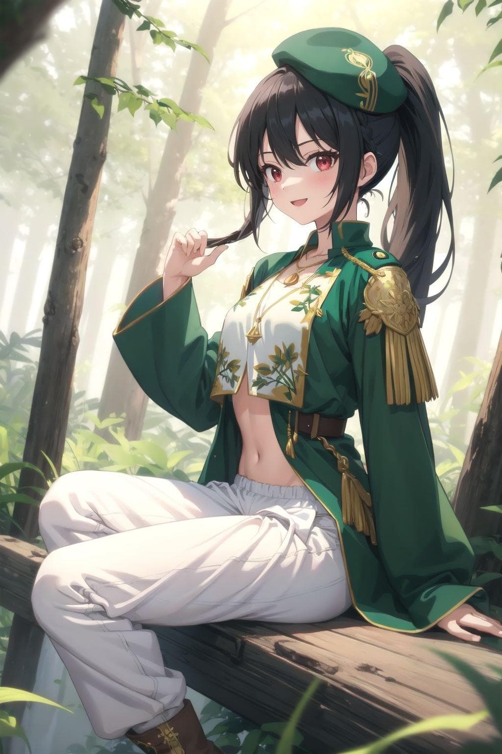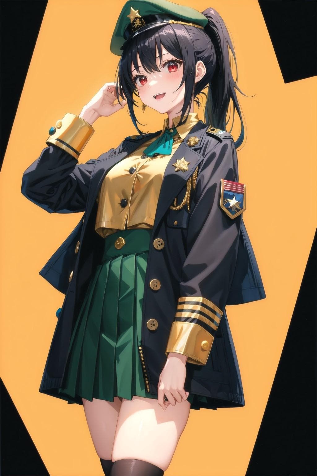 (green, black, gold color palette:1.3),BREAK,(black military-style jacket with gold buttons:1.4),(green pleated skirt:1.2),black combat boots,(gold star-shaped brooch:1.1),(green beret:1.2)