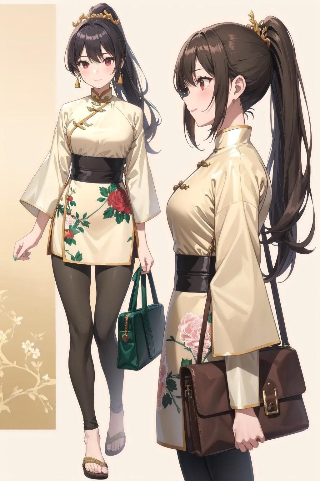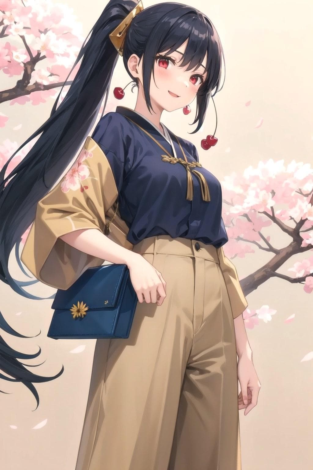 (navy blue, gold, beige color palette:1.3),(Wide beige pants:1.4),(navy blue haori with gold cherry blossom embroidery:1.2),(Navy blue and gold clutch bag:1.2)