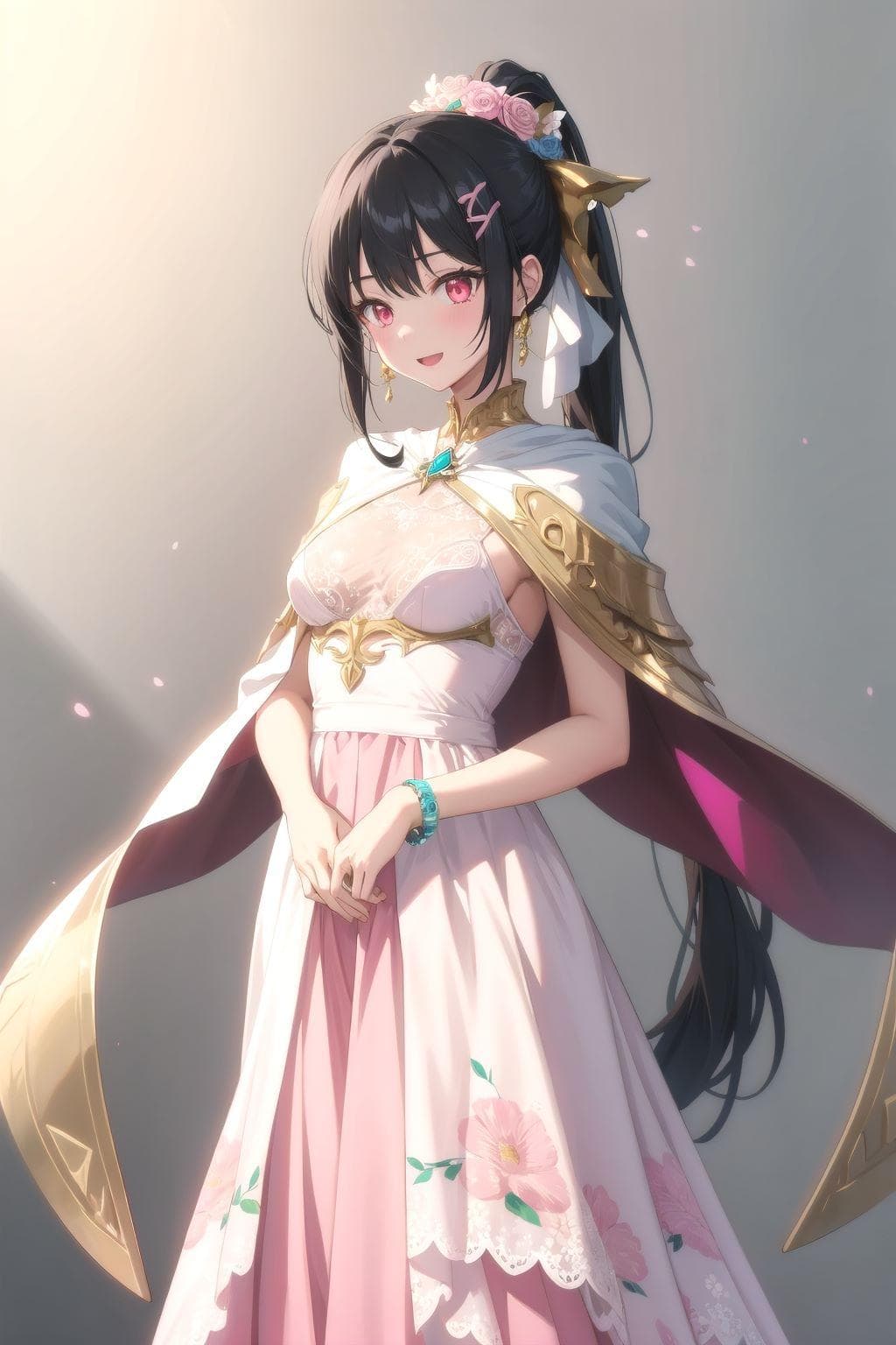 (pastel pink white gold color palette:1.3),(pastel pink gown with white lace and glowing floral accents:1.4),(white lace cape with gold trim:1.2),gold ballet flats,(white floral hair pins:1.1),(gemstone bracelet:1.1)