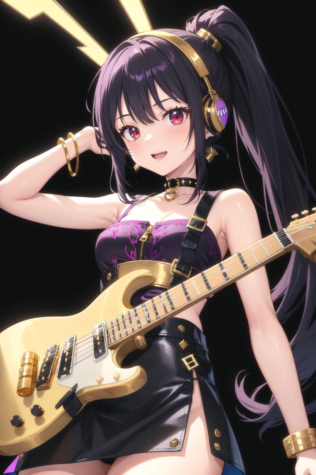 (purple black gold color palette:1.3),(purple velvet top with gold embroidery:1.4),(black high-waisted leather skirt with gold zippers:1.3),(black ankle boots with gold studs:1.1),(purple choker with gold accents:1.1),(black and gold bangles:1.1),(Purple electric guitar:1.3),(headphone)