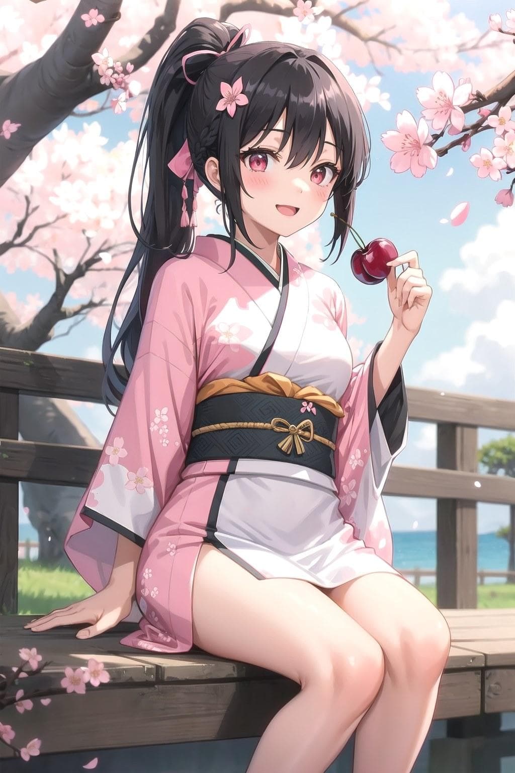 (Pink, black, cream color palette:1.3),(Pink cherry blossom pattern on cream kimono dress:1.4),(Black obi: 1.2),(Cherry blossom hairpin:1.2),(Zori sandals)