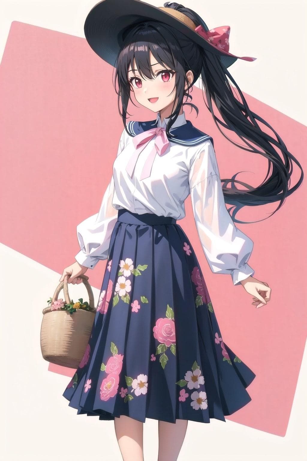 (pink, white,navy color palette:1.3),(white blouse with navy floral print:1.4),(pink pleated midi skirt:1.2),white sandals,(navy sun hat:1.1),(woven basket:1.2)