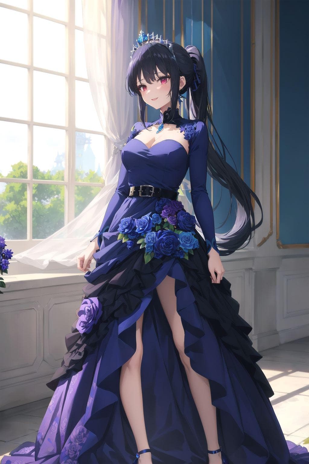 (royal blue violet silver color palette:1.3),(royal blue gown with violet floral appliqué:1.4),(silver belt:1.2),violet velvet shoes,(silver tiara with blue gems:1.1)