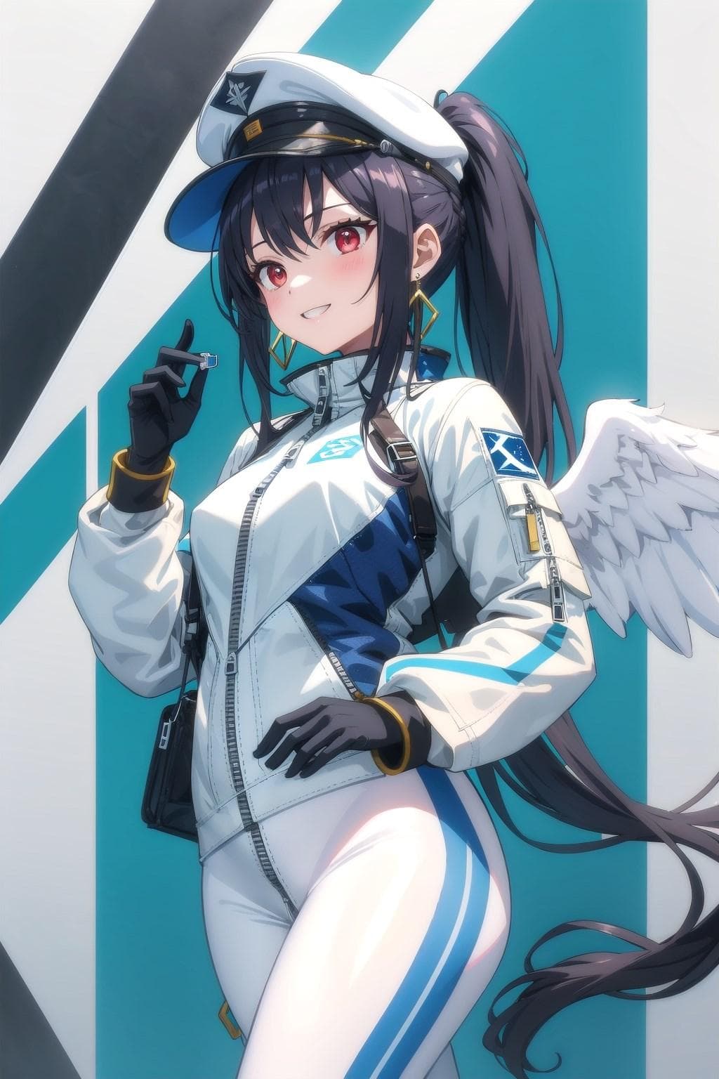 (blue, silver, white color palette:1.3),BREAK,(white flight suit with silver zippers:1.3),(white high-top sneakers),(silver earrings:1.1),(blue pilot cap:1.2)
