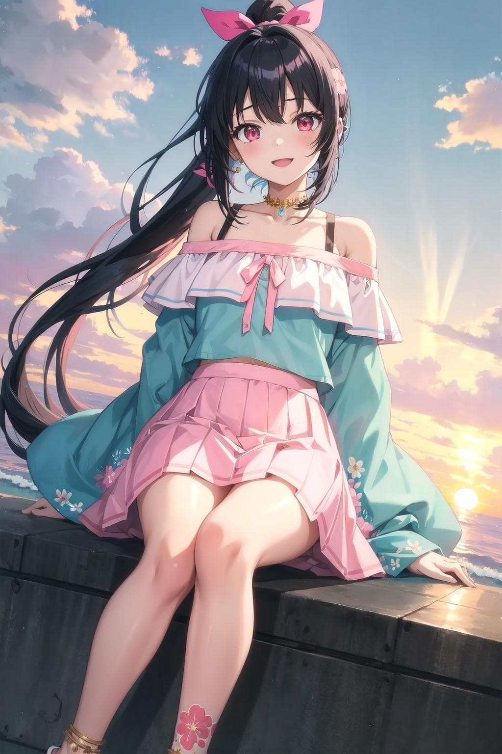 (light blue sunset pink white color palette:1.3),(light blue off-shoulder top with sunset pink floral embroidery:1.4),(white flowing skirt:1.2),pink flat sandals,(blue and pink floral hair pins:1.1),(delicate silver anklet:1.1)