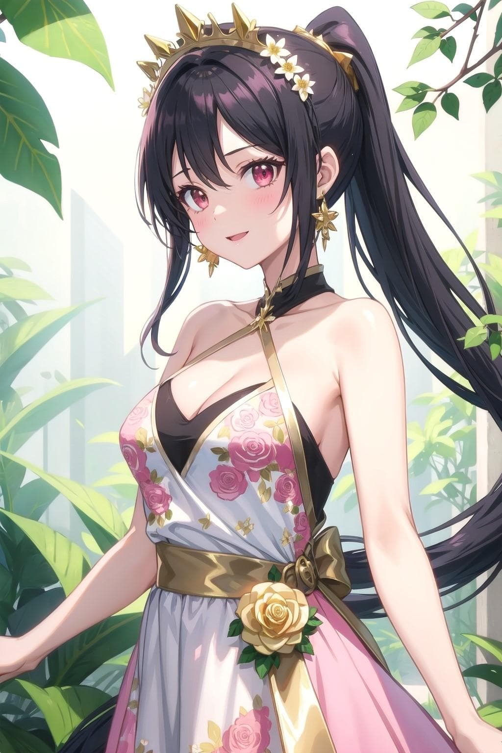 (green, pink, gold color palette:1.3),BREAK,(pink floral gown with green leaves:1.4),(gold flower crown:1.2),green ballet flats,(rose-shaped earrings:1.1),(magic wand with gemstone)