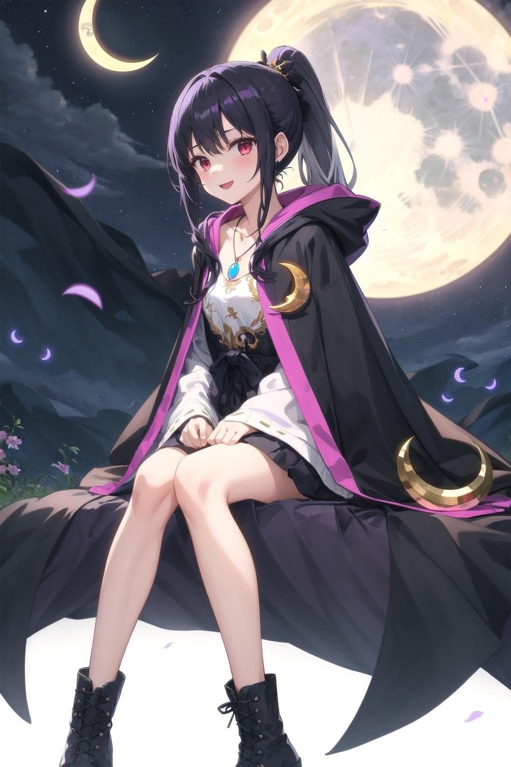 (purple, black, silver color palette:1.3),BREAK,(black velvet robe with silver crescent moon embroidery:1.4),(purple hooded cloak:1.2),black lace-up boots,(moonstone necklace:1.1),(silver circlet:1.2)