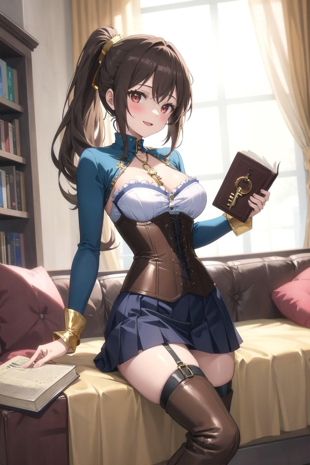 (blue, brown, gold color palette:1.3),BREAK,(brown leather corset with gold trim:1.4),(blue velvet skirt:1.2),brown knee-high boots,(antique key pendant:1.1),(book-shaped clutch:1.2)