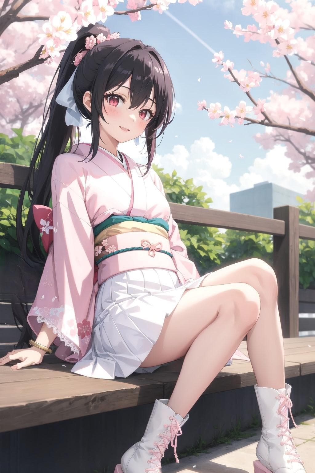 (pastel pink white color palette:1.3),(pastel pink kimono-style top with white lace trim:1.4),(white flowy skirt:1.4),(White lace-up boots with pink laces),(white floral hairpin:1.1),(delicate cherry blossom bracelet:1.1)