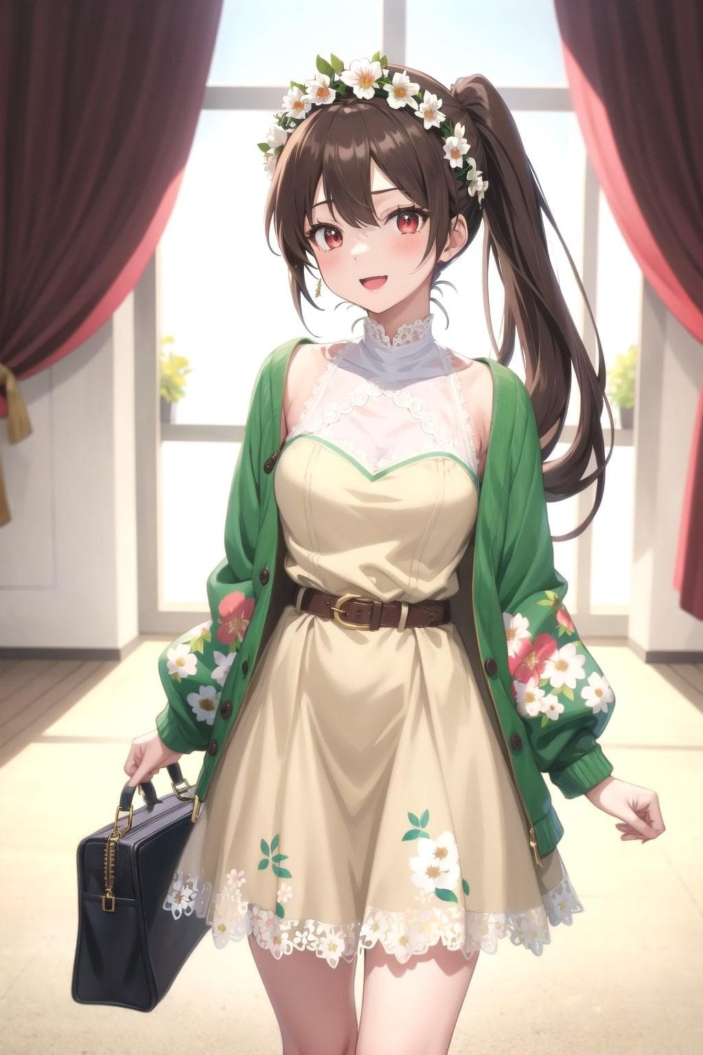 (red pink white color palette:1.3),(red floral dress with white lace accents:1.4),(pink cardigan:1.2),white ballet flats,(azalea hairpins:1.1),(pink beaded bracelet:1.1)