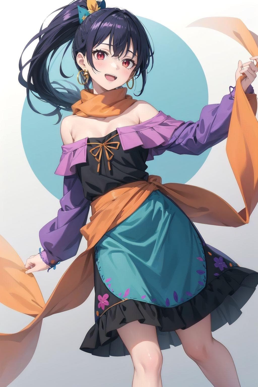 (purple orange blue color palette:1.3),(purple off-shoulder top with blue embroidery:1.4),(orange midi skirt:1.2),blue sandals,(purple and blue gradient scarf:1.1),(orange drop earrings:1.1)