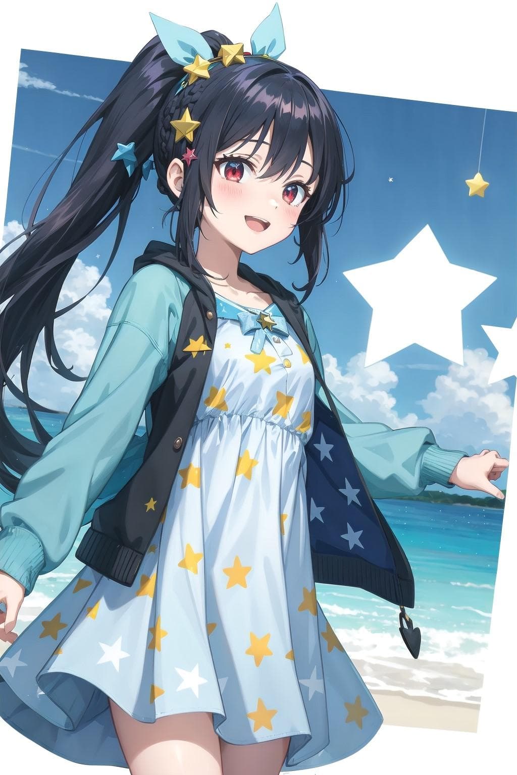 (Sky blue, white, silver color palette:1.3),(Sky blue dress with white star print:1.4),(Silver cardigan: 1.2),(Star shaped hair accessory:1.2)