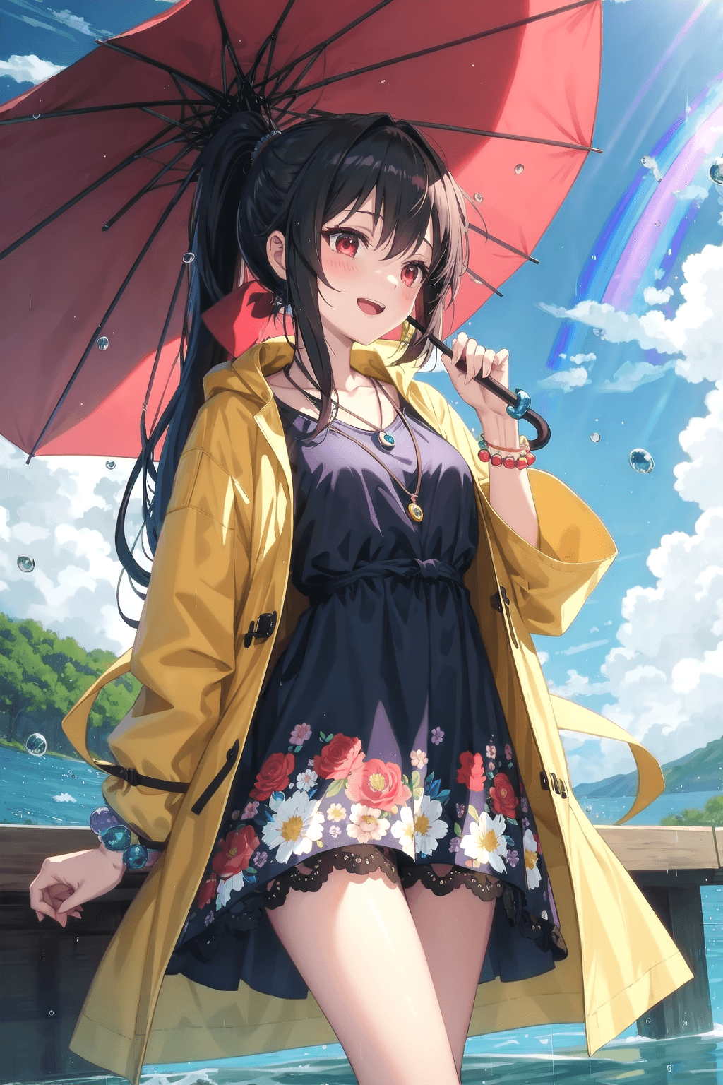 (Rainbow-colored floral dress:1.3), (raincoat:1.2), (White lace umbrella:1.1), Clear rain boots, (Pendant in the shape of a water drop:1.1), (Iridescent beaded bracelet:1.1)