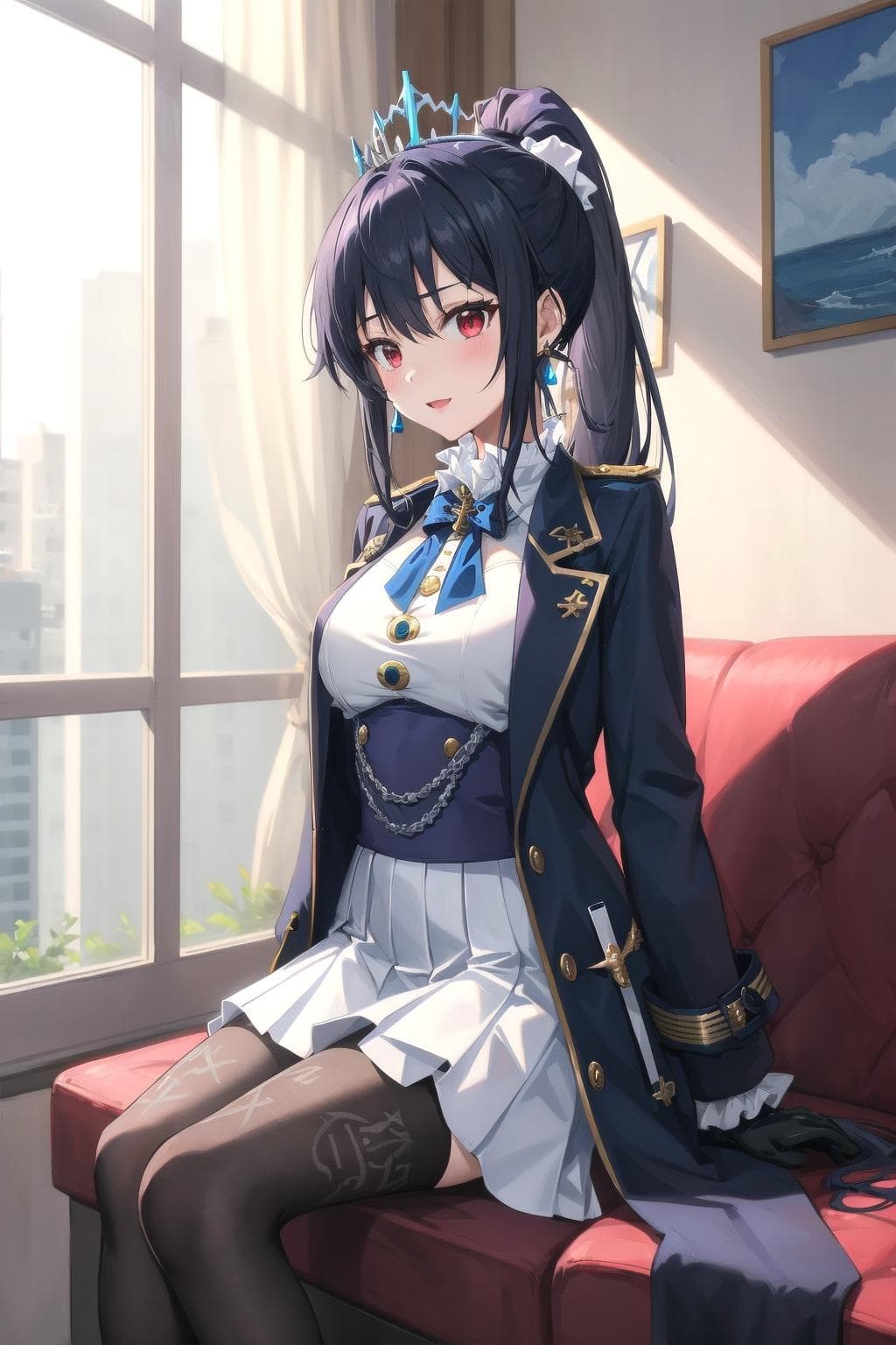 (navy blue silver white color palette:1.3),(navy blue long coat with silver runic patterns:1.4),(white silk blouse with ruffled collar:1.4),(silver brocade skirt:1.4),(velvet gloves:1.2),(silver tiara with blue gems:1.1),(pearl earrings:1.1)