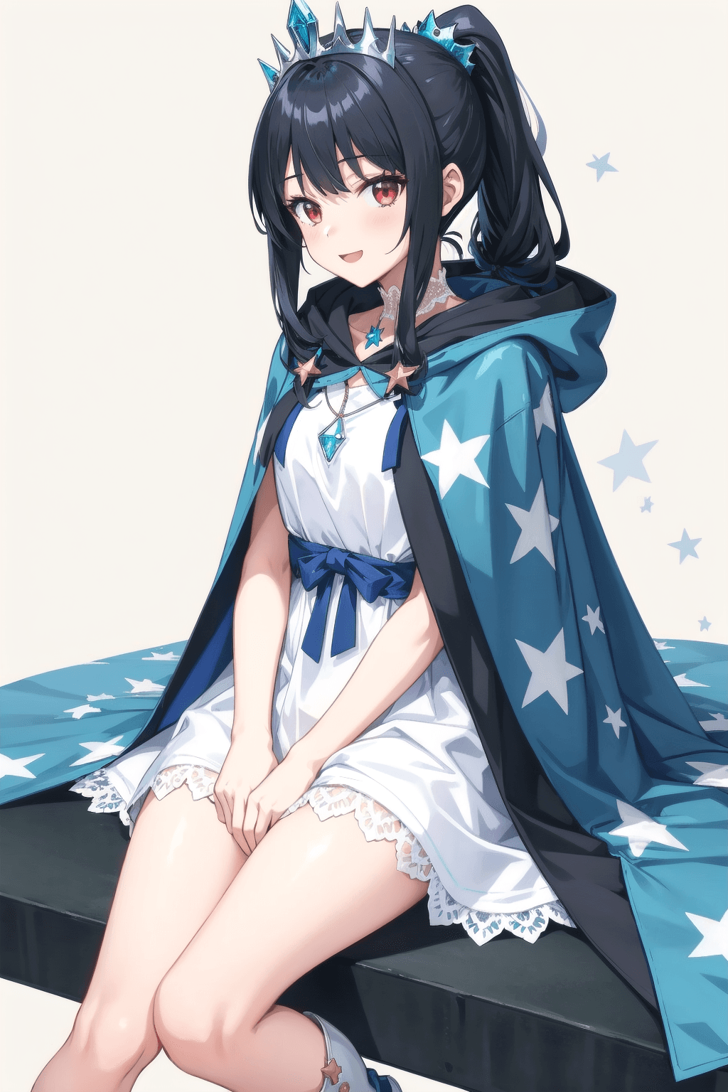 (blue, silver, white color palette:1.3),BREAK,(white lace-trimmed dress with silver star patterns:1.4),(blue cloak with hood:1.2),silver ankle boots,(star-shaped pendant:1.1),(crystal tiara:1.2)