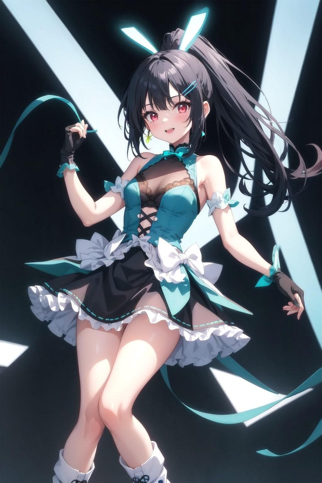 (neon blue white black color palette:1.3),(neon blue lace top:1.3),(black tutu skirt with blue lights:1.4),(white platform boots with neon blue details),(black fingerless lace gloves:1.1),(neon blue hair clip with white accents:1.1)