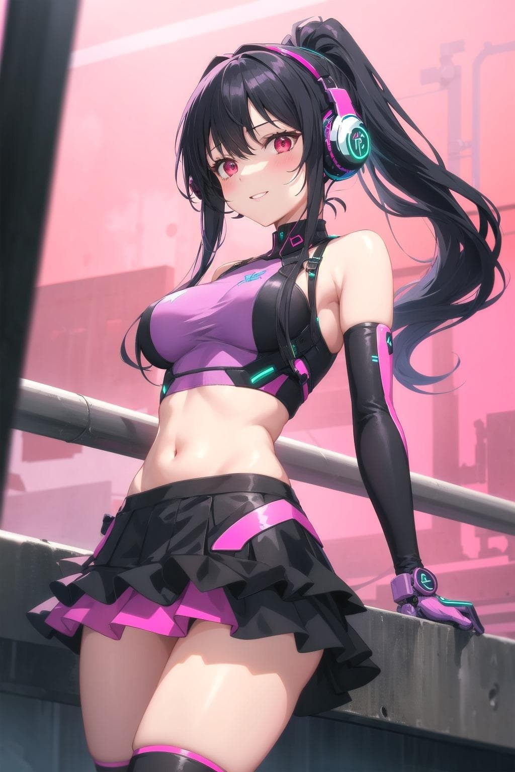 (neon pink purple black color palette:1.3),(neon pink top with purple gear designs:1.2),(black layered skirt with neon pink trim:1.3),purple combat boots,(neon pink and black mechanical arm sleeves:1.1), (mechanical headphones:1.2)
