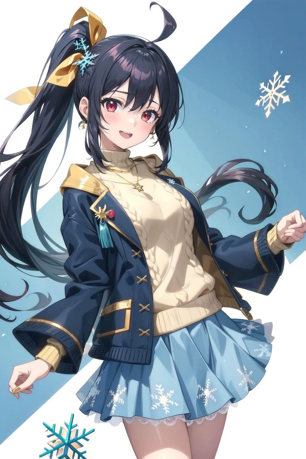 (ice blue white gold color palette:1.3),(ice blue tulle skirt with white snowflake patterns:1.3),(white knitted sweater:1.2),(blue velvet bolero jacket:1.2),gold ankle boots,(crystal pendant necklace:1.1),(blue and gold ribbon hairband:1.1)